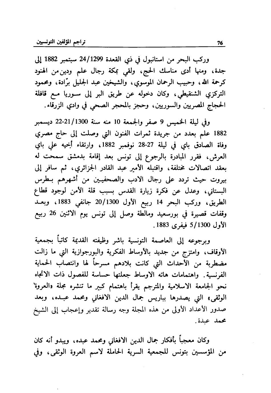 وبرجوعه إلى العاصمة التونسية باشر وظيفته القديمة كاتبا بجمعية الأوقاف، وامتزج من جديد بالأوساط الفكرية والبورجوازية التي ما زالت مضطربة من الأحداث التي كانت بلادهم مسرحا لها وانتصاب الحماية الفرنسية. واهتمامات هاته الاوساط جعلتها حساسة للفصول ذات الاتجاه نحو الجامعة الاسلامية والمترجم يقرأ باهتمام كبير ما تنشره مجلة «العروة الوثقى» التي يصدرها بباريس جمال الدين الافغاني ومحمد عبده، وبعد صدور الأعداد الأولى من هذه المجلة وجه رسالة تقدير وإعجاب إلى الشيخ محمد عبدة.