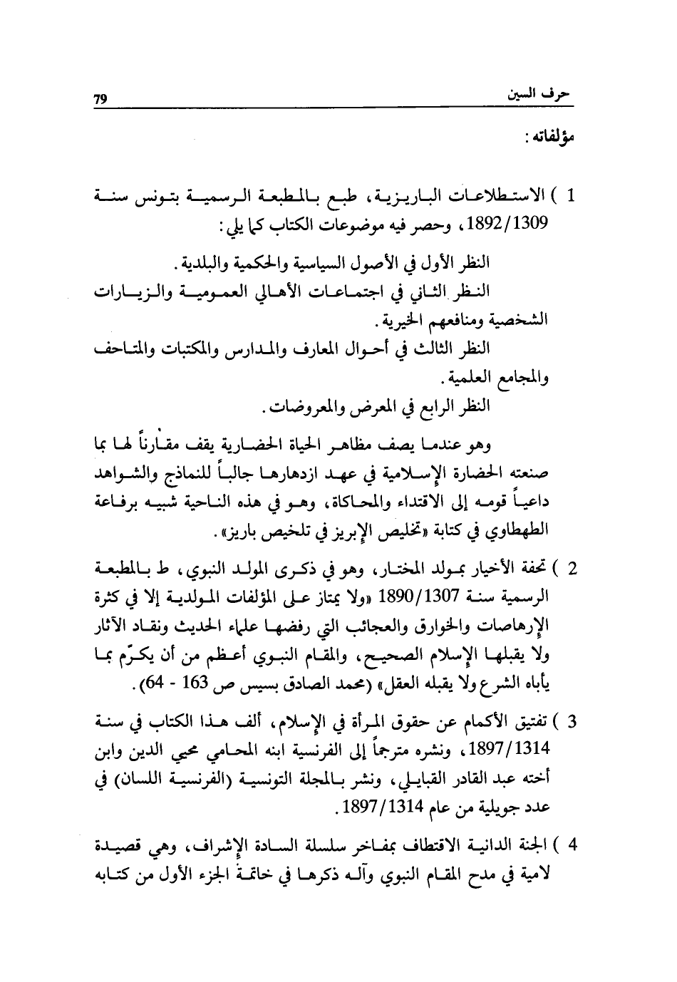 2) تحفة الأخيار بمولد المختار، وهو في ذكرى المولد النبوي، ط بالمطبعة الرسمية سنة 1307/ 1890 «ولا يمتاز على المؤلفات المولدية إلا في كثرة الإرهاصات والخوارق والعجائب التي رفضها علماء الحديث ونقاد الآثار ولا يقبلها الإسلام الصحيح، والمقام النبوي أعظم من أن يكرّم بما يأباه الشرع ولا يقبله العقل» (محمد الصادق بسيس ص 163 - 64).