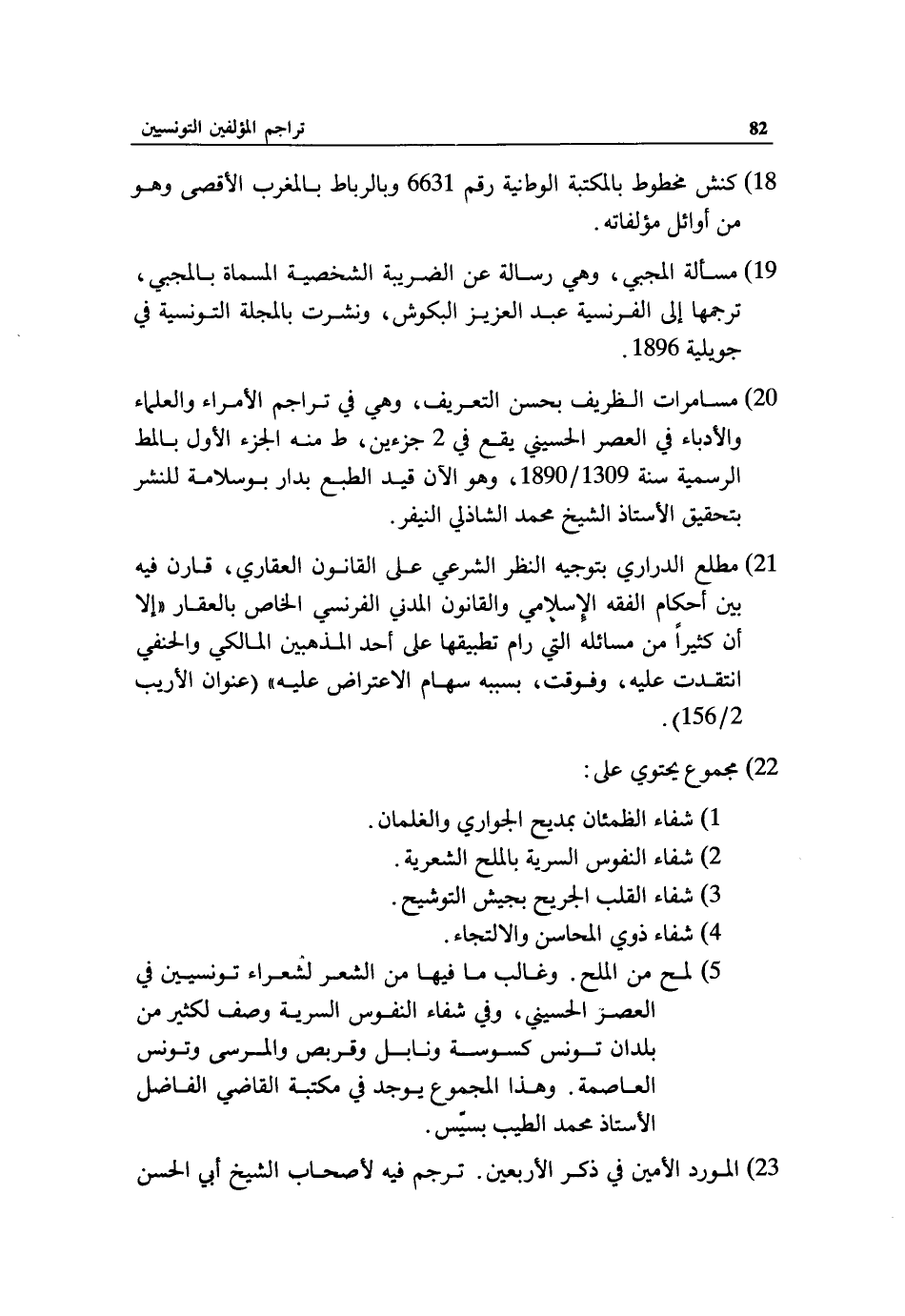 20) مسامرات الظريف بحسن التعريف، وهي في تراجم الأمراء والعلماء والأدباء في العصر الحسيني يقع في 2 جزءين، ط منه الجزء الأول بالمط الرسمية سنة 1309/ 1890، وهو الآن قيد الطبع بدار بوسلامة للنشر بتحقيق الأستاذ الشيخ محمد الشاذلي النيفر.