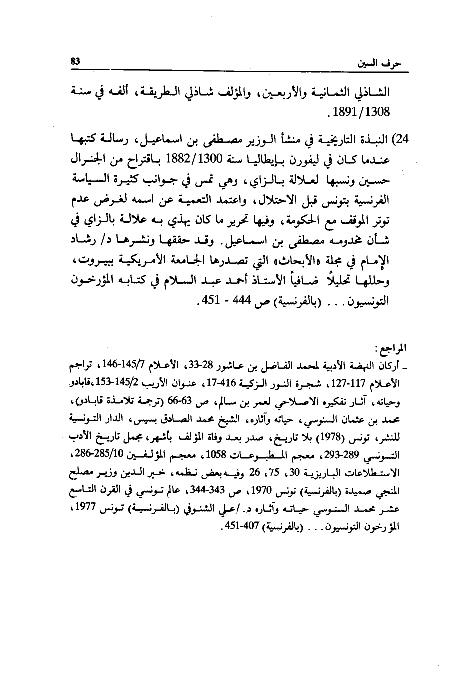 24) النبذة التاريخية في منشأ الوزير مصطفى بن اسماعيل، رسالة كتبها عند ما كان في ليفورن بإيطاليا سنة 1300/ 1882 باقتراح من الجنرال حسين ونسبها لعلالة بالزاي، وهي تمس في جوانب كثيرة السياسة الفرنسية بتونس قبل الاحتلال، واعتمد التعمية عن اسمه لغرض عدم توتر الموقف مع الحكومة، وفيها تحرير ما كان يهذي به علالة بالزاي في شأن مخدومه مصطفى بن اسماعيل. وقد حققها ونشرها د/رشاد الإمام في مجلة «الأبحاث» التي تصدرها الجامعة الأمريكية ببيروت، وحللها تحليلا ضافيا الأستاذ أحمد عبد السلام في كتابه المؤرخون التونسيون ... (بالفرنسية) ص 444 - 451.