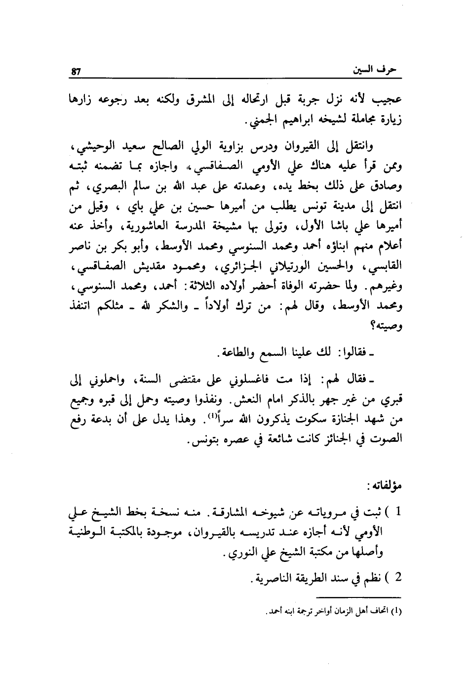 - فقال لهم: إذا مت فاغسلوني على مقتضى السنة، واحملوني إلى قبري من غير جهر بالذكر امام النعش. ونفذوا وصيته وحمل إلى قبره وجميع من شهد الجنازة سكوت يذكرون الله سرا (¬1). وهذا يدل على أن بدعة رفع الصوت في الجنائز كانت شائعة في عصره بتونس.