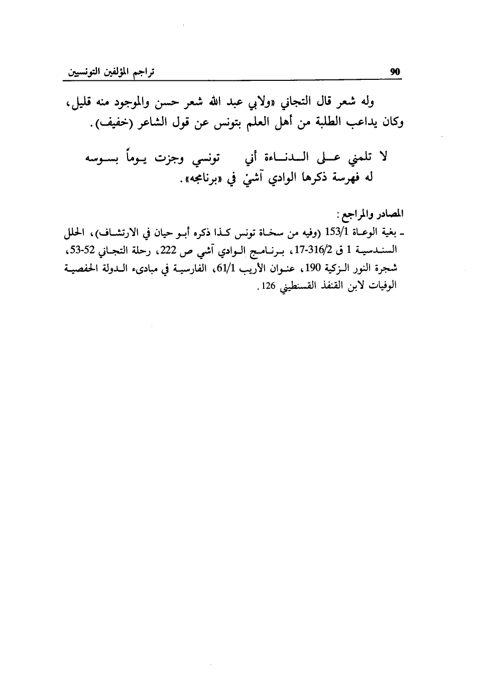 - بغية الوعاة 1/ 153 (وفيه من سخاة تونس كذا ذكره أبو حيان في الارتشاف)، الحلل السندسية 1 ق 2/ 316 - 17، برنامج الوادي آشي ص 222، رحلة التجاني 52 - 53، شجرة النور الزكية 190، عنوان الأريب 1/ 61، الفارسية في مبادئ الدولة الحفصية الوفيات لابن القنفذ القسنطيني 126.