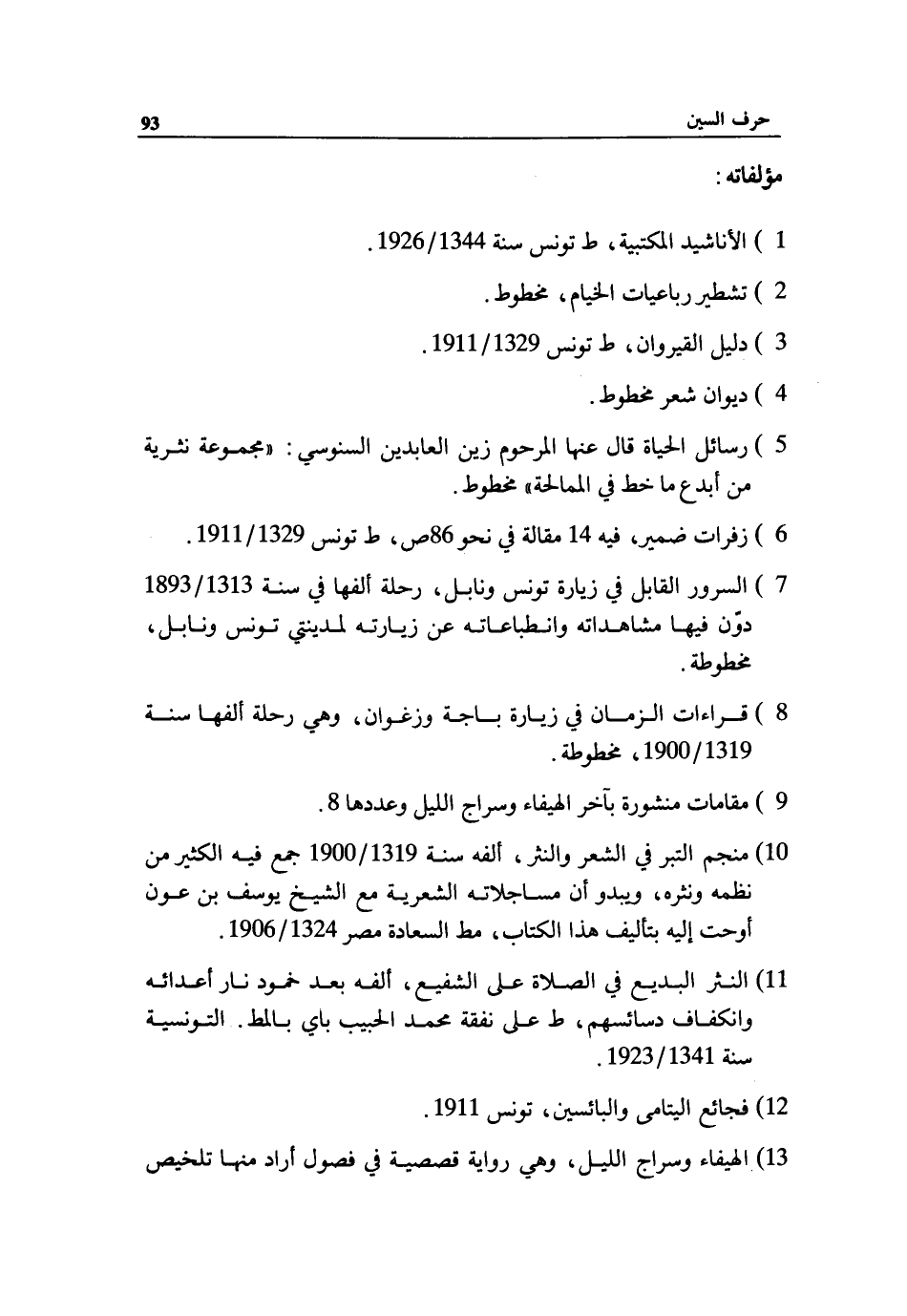 1) الأناشيد المكتبية، ط تونس سنة 1344/ 1926.