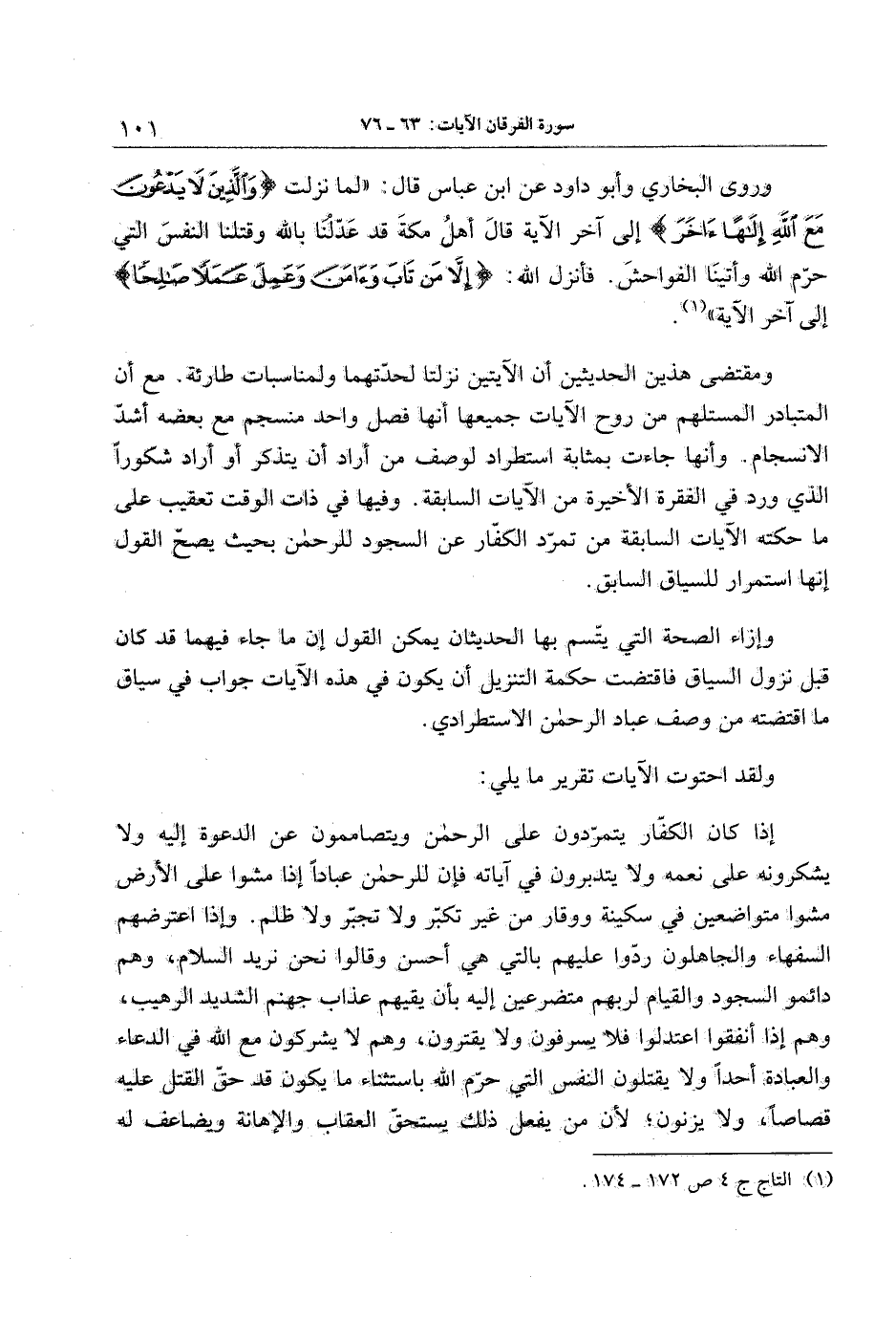 ومقتضى هذين الحديثين أن الآيتين نزلتا لحدّتهما ولمناسبات طارئة. مع أن المتبادر المستلهم من روح الآيات جميعها أنها فصل واحد منسجم مع بعضه أشدّ الانسجام. وأنها جاءت بمثابة استطراد لوصف من أراد أن يتذكر أو أراد شكورا الذي ورد في الفقرة الأخيرة من الآيات السابقة. وفيها في ذات الوقت تعقيب على ما حكته الآيات السابقة من تمرّد الكفّار عن السجود للرحمن بحيث يصحّ القول إنها استمرار للسياق السابق.