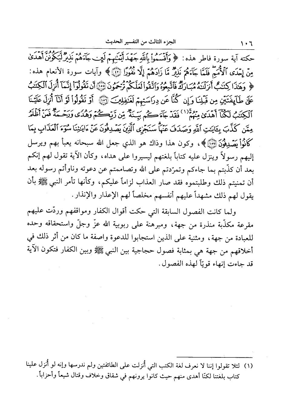 وَهذا كِتابٌ أَنْزَلْناهُ مُبارَكٌ فَاتَّبِعُوهُ وَاتَّقُوا لَعَلَّكُمْ تُرْحَمُونَ (155) أَنْ تَقُولُوا إِنَّما أُنْزِلَ الْكِتابُ عَلى طائِفَتَيْنِ مِنْ قَبْلِنا وَإِنْ كُنَّا عَنْ دِراسَتِهِمْ لَغافِلِينَ (156) أَوْ تَقُولُوا لَوْ أَنَّا أُنْزِلَ عَلَيْنَا الْكِتابُ لَكُنَّا أَهْدى مِنْهُمْ «1» فَقَدْ جاءَكُمْ بَيِّنَةٌ مِنْ رَبِّكُمْ وَهُدىً وَرَحْمَةٌ فَمَنْ أَظْلَمُ مِمَّنْ كَذَّبَ بِآياتِ اللَّهِ وَصَدَفَ عَنْها سَنَجْزِي الَّذِينَ يَصْدِفُونَ عَنْ آياتِنا سُوءَ الْعَذابِ بِما كانُوا يَصْدِفُونَ (157) ، وكون هذا وذاك هو الذي جعل الله سبحانه يعبأ بهم ويرسل إليهم رسولا وينزل عليه كتابا بلغتهم ليسيروا على هداه، وكأن الآية تقول لهم إنكم بعد أن كذّبتم بما جاءكم وتمرّدتم على الله وتصاممتم عن دعوته وناوأتم رسوله بعد أن تمنيتم ذلك وطلبتموه فقد صار العذاب لزاما عليكم، وكأنها تأمر النبي صلى الله عليه وسلم بأن يقول لهم ذلك مشهدا عليهم أنفسهم مخلصا لهم الإعذار والإنذار.