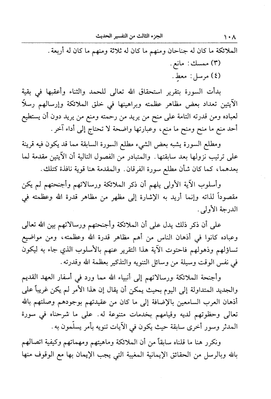 وأسلوب الآية الأولى يلهم أن ذكر الملائكة ورسالاتهم وأجنحتهم لم يكن مقصودا لذاته وإنما أريد به الإشارة إلى مظهر من مظاهر قدرة الله وعظمته في الدرجة الأولى.