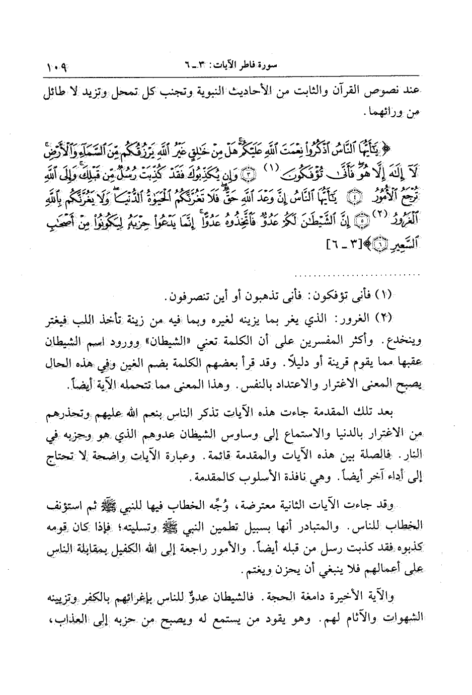 يا أَيُّهَا النَّاسُ اذْكُرُوا نِعْمَتَ اللَّهِ عَلَيْكُمْ هَلْ مِنْ خالِقٍ غَيْرُ اللَّهِ يَرْزُقُكُمْ مِنَ السَّماءِ وَالْأَرْضِ لا إِلهَ إِلاَّ هُوَ فَأَنَّى تُؤْفَكُونَ (3) وَإِنْ يُكَذِّبُوكَ فَقَدْ كُذِّبَتْ رُسُلٌ مِنْ قَبْلِكَ وَإِلَى اللَّهِ تُرْجَعُ الْأُمُورُ (4) يا أَيُّهَا النَّاسُ إِنَّ وَعْدَ اللَّهِ حَقٌّ فَلا تَغُرَّنَّكُمُ الْحَياةُ الدُّنْيا وَلا يَغُرَّنَّكُمْ بِاللَّهِ الْغَرُورُ (5) إِنَّ الشَّيْطانَ لَكُمْ عَدُوٌّ فَاتَّخِذُوهُ عَدُوًّا إِنَّما يَدْعُوا حِزْبَهُ لِيَكُونُوا مِنْ أَصْحابِ السَّعِيرِ (6)