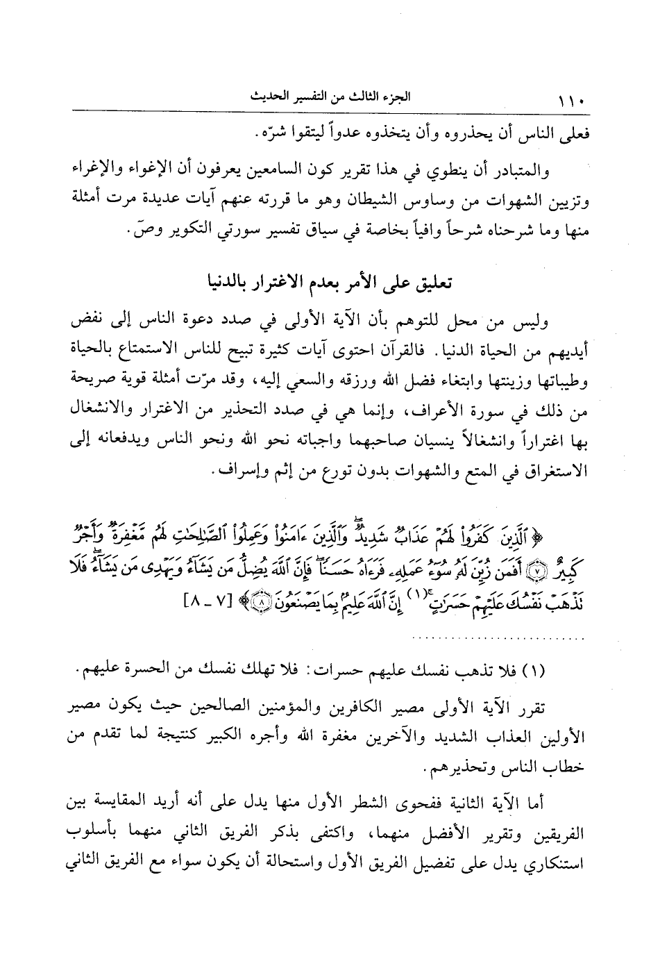 وليس من محل للتوهم بأن الآية الأولى في صدد دعوة الناس إلى نفض أيديهم من الحياة الدنيا. فالقرآن احتوى آيات كثيرة تبيح للناس الاستمتاع بالحياة وطيباتها وزينتها وابتغاء فضل الله ورزقه والسعي إليه، وقد مرّت أمثلة قوية صريحة من ذلك في سورة الأعراف، وإنما هي في صدد التحذير من الاغترار والانشغال بها اغترارا وانشغالا ينسيان صاحبهما واجباته نحو الله ونحو الناس ويدفعانه إلى الاستغراق في المتع والشهوات بدون تورع من إثم وإسراف.