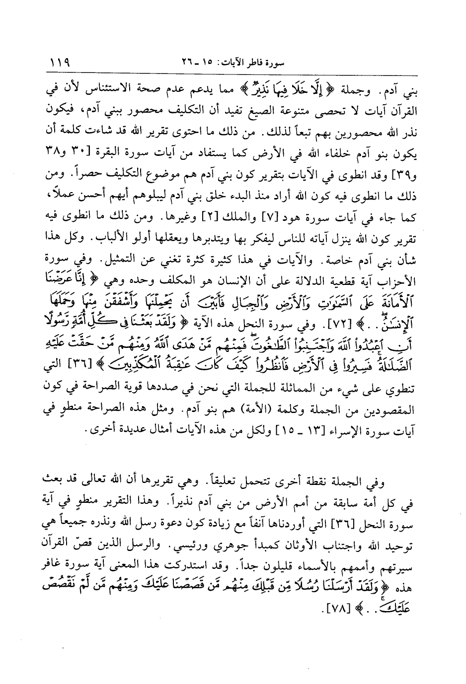 بني آدم. وجملة إِلَّا خَلا فِيها نَذِيرٌ مما يدعم عدم صحة الاستئناس لأن في القرآن آيات لا تحصى متنوعة الصيغ تفيد أن التكليف محصور ببني آدم، فيكون نذر الله محصورين بهم تبعا لذلك. من ذلك ما احتوى تقرير الله قد شاءت كلمة أن يكون بنو آدم خلفاء الله في الأرض كما يستفاد من آيات سورة البقرة [30 و 38 و 39] وقد انطوى في الآيات بتقرير كون بني آدم هم موضوع التكليف حصرا. ومن ذلك ما انطوى فيه كون الله أراد منذ البدء خلق بني آدم ليبلوهم أيهم أحسن عملا، كما جاء في آيات سورة هود [7] والملك [2] وغيرها. ومن ذلك ما انطوى فيه تقرير كون الله ينزل آياته للناس ليفكر بها ويتدبرها ويعقلها أولو الألباب. وكل هذا شأن بني آدم خاصة. والآيات في هذا كثيرة كثرة تغني عن التمثيل. وفي سورة الأحزاب آية قطعية الدلالة على أن الإنسان هو المكلف وحده وهي إِنَّا عَرَضْنَا الْأَمانَةَ عَلَى السَّماواتِ وَالْأَرْضِ وَالْجِبالِ فَأَبَيْنَ أَنْ يَحْمِلْنَها وَأَشْفَقْنَ مِنْها وَحَمَلَهَا الْإِنْسانُ.. [72] . وفي سورة النحل هذه الآية وَلَقَدْ بَعَثْنا فِي كُلِّ أُمَّةٍ رَسُولًا أَنِ اعْبُدُوا اللَّهَ وَاجْتَنِبُوا الطَّاغُوتَ فَمِنْهُمْ مَنْ هَدَى اللَّهُ وَمِنْهُمْ مَنْ حَقَّتْ عَلَيْهِ الضَّلالَةُ فَسِيرُوا فِي الْأَرْضِ فَانْظُرُوا كَيْفَ كانَ عاقِبَةُ الْمُكَذِّبِينَ [36] التي تنطوي على شيء من المماثلة للجملة التي نحن في صددها قوية الصراحة في كون المقصودين من الجملة وكلمة (الأمة) هم بنو آدم. ومثل هذه الصراحة منطو في آيات سورة الإسراء [13- 15] ولكل من هذه الآيات أمثال عديدة أخرى.
