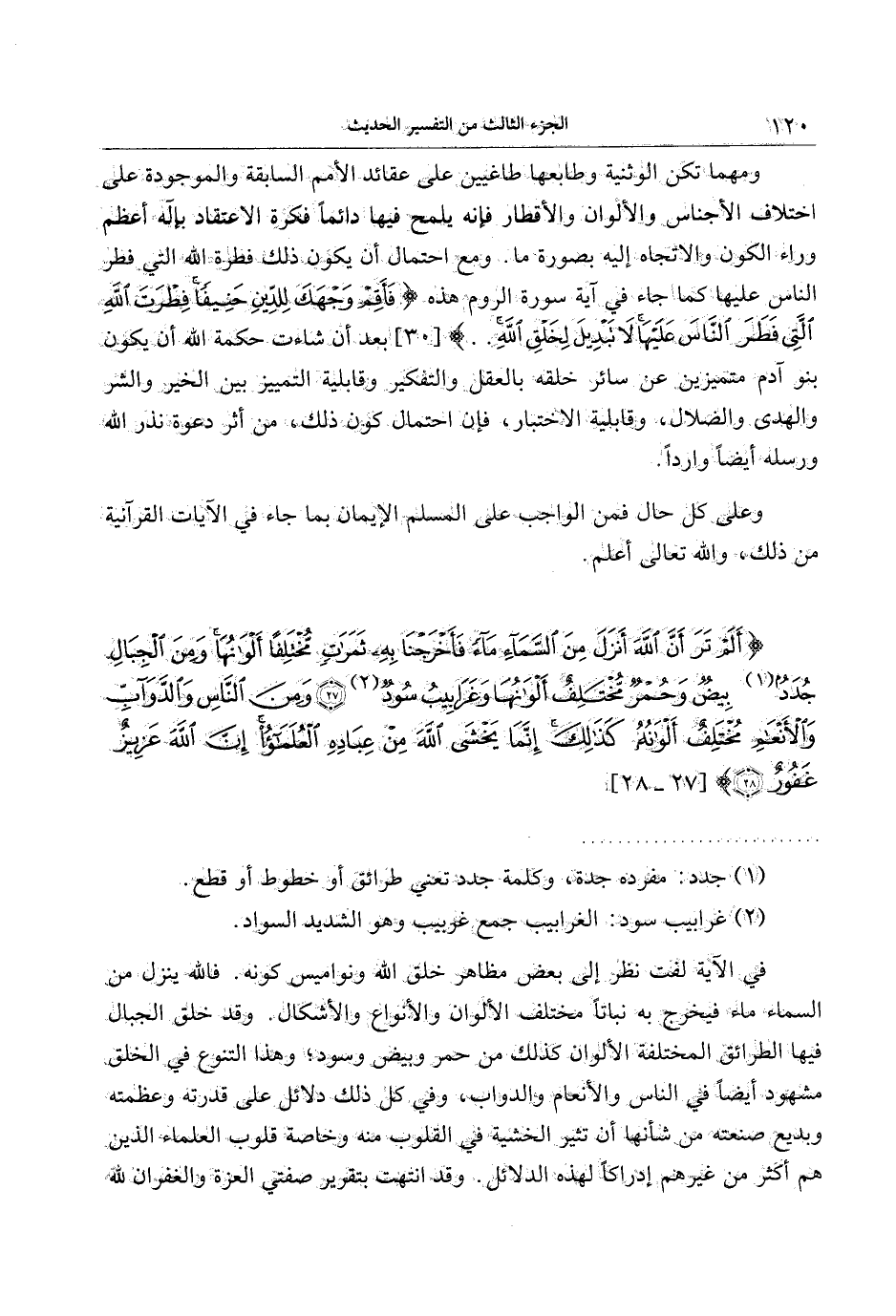 أَلَمْ تَرَ أَنَّ اللَّهَ أَنْزَلَ مِنَ السَّماءِ ماءً فَأَخْرَجْنا بِهِ ثَمَراتٍ مُخْتَلِفاً أَلْوانُها وَمِنَ الْجِبالِ جُدَدٌ بِيضٌ وَحُمْرٌ مُخْتَلِفٌ أَلْوانُها وَغَرابِيبُ سُودٌ (27) وَمِنَ النَّاسِ وَالدَّوَابِّ وَالْأَنْعامِ مُخْتَلِفٌ أَلْوانُهُ كَذلِكَ إِنَّما يَخْشَى اللَّهَ مِنْ عِبادِهِ الْعُلَماءُ إِنَّ اللَّهَ عَزِيزٌ غَفُورٌ (28)