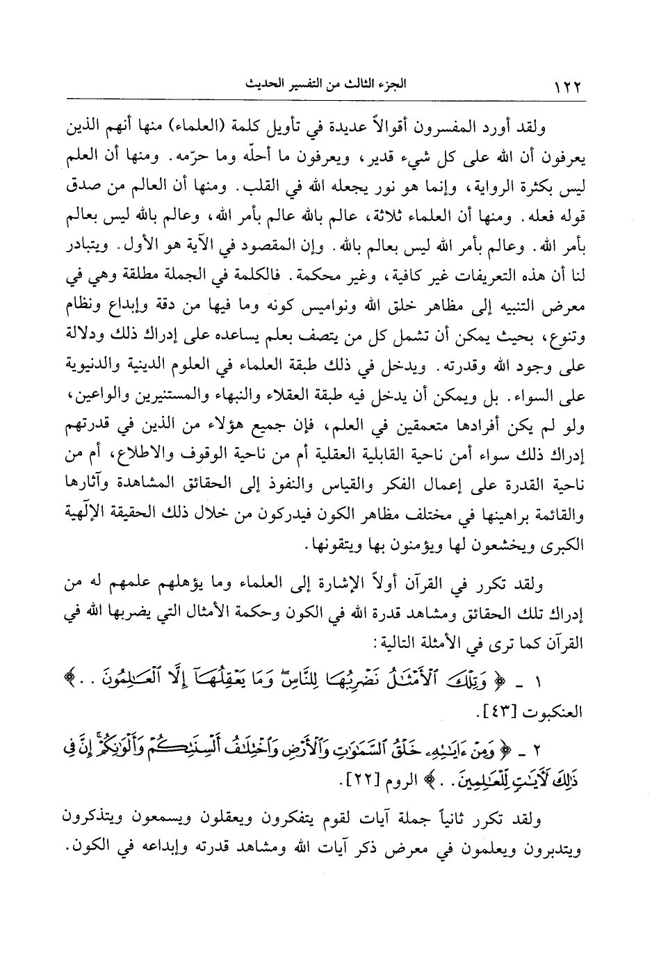 ولقد أورد المفسرون أقوالا عديدة في تأويل كلمة (العلماء) منها أنهم الذين يعرفون أن الله على كل شيء قدير، ويعرفون ما أحلّه وما حرّمه. ومنها أن العلم ليس بكثرة الرواية-، وإنما هو نور يجعله الله في القلب. ومنها أن العالم من صدق قوله فعله. ومنها أن العلماء ثلاثة، عالم بالله عالم بأمر الله، وعالم بالله ليس بعالم بأمر الله. وعالم بأمر الله ليس بعالم بالله. وإن المقصود في الآية هو الأول. ويتبادر لنا أن هذه التعريفات غير كافية، وغير محكمة. فالكلمة في الجملة مطلقة وهي في معرض التنبيه إلى مظاهر خلق الله ونواميس كونه وما فيها من دقة وإبداع ونظام وتنوع، بحيث يمكن أن تشمل كل من يتصف بعلم يساعده على إدراك ذلك ودلالة على وجود الله وقدرته. ويدخل في ذلك طبقة العلماء في العلوم الدينية والدنيوية على السواء. بل ويمكن أن يدخل فيه طبقة العقلاء والنبهاء والمستنيرين والواعين، ولو لم يكن أفرادها متعمقين في العلم، فإن جميع هؤلاء من الذين في قدرتهم إدراك ذلك سواء أمن ناحية القابلية العقلية أم من ناحية الوقوف والاطلاع، أم من ناحية القدرة على إعمال الفكر والقياس والنفوذ إلى الحقائق المشاهدة وآثارها والقائمة براهينها في مختلف مظاهر الكون فيدركون من خلال ذلك الحقيقة الإلهية الكبرى ويخشعون لها ويؤمنون بها ويتقونها.