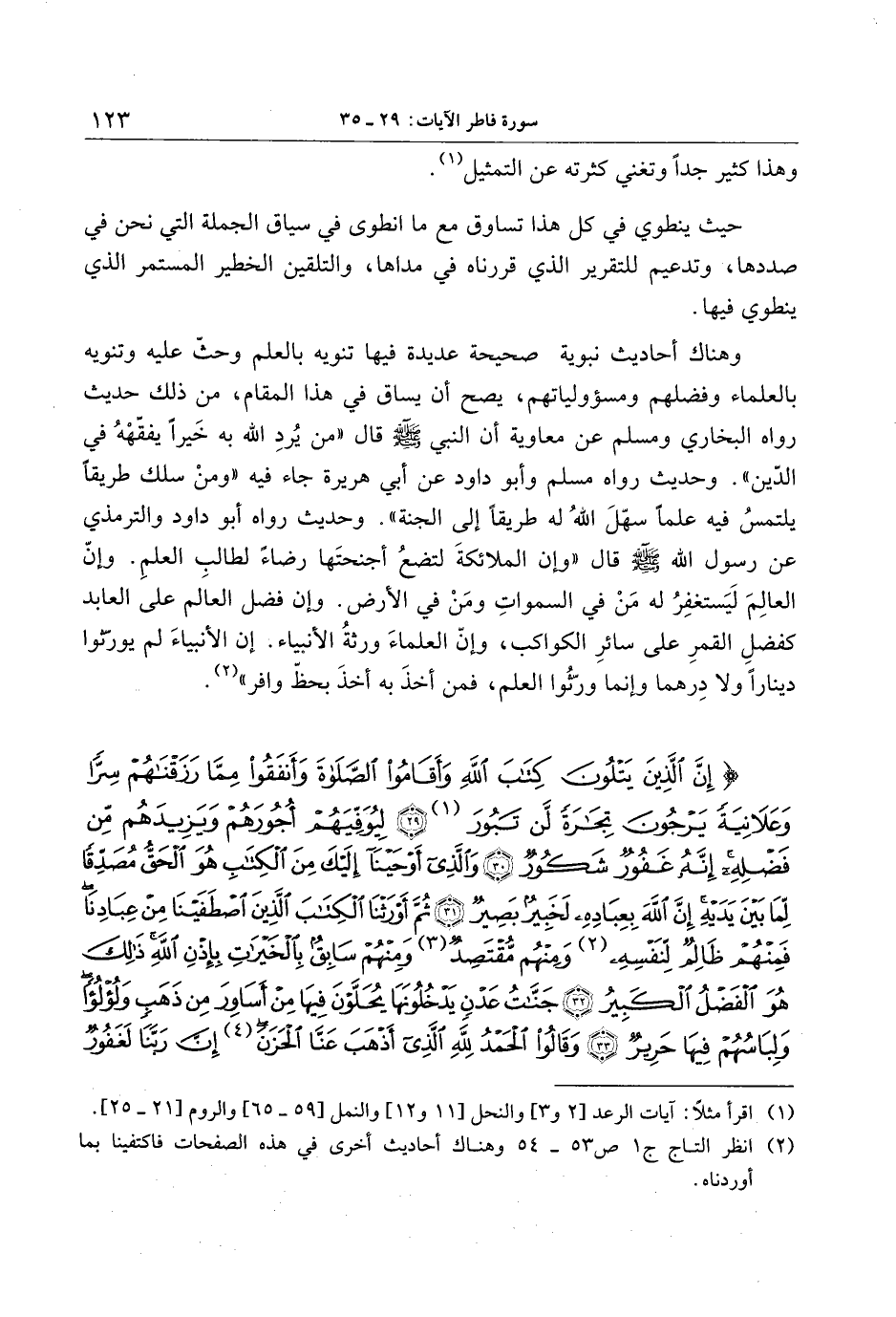 وهناك أحاديث نبوية صحيحة عديدة فيها تنويه بالعلم وحثّ عليه وتنويه بالعلماء وفضلهم ومسؤولياتهم، يصح أن يساق في هذا المقام، من ذلك حديث رواه البخاري ومسلم عن معاوية أن النبي صلى الله عليه وسلم قال «من يرد الله به خيرا يفقهه في الدّين» . وحديث رواه مسلم وأبو داود عن أبي هريرة جاء فيه «ومن سلك طريقا يلتمس فيها علما سهل الله له طريقا إلى الجنة» وحديث رواه أبو داود والترمذي عن رسول الله صلى الله عليه وسلم قال «وإنّ الملائكة لتضع أجنحتها رضاء لطالب العلم. وإنّ العالم ليستغفر له من في السموات ومن في الأرض. وإن فضل العالم على العابد كفضل القمر على سائر الكواكب، وإنّ العلماء ورثة الأنبياء. إن الأنبياء لم يورّثوا دينارا ولا درهما وإنما ورّثوا العلم، فمن أخذ به أخذ بحظّ وافر» «2» .