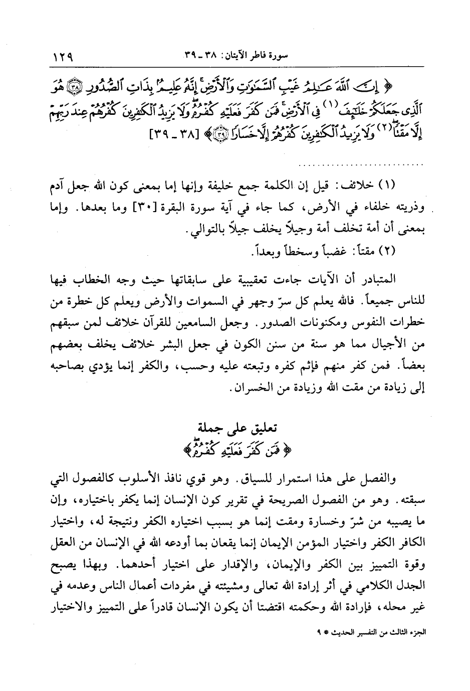والفصل على هذا استمرار للسياق. وهو قوي نافذ الأسلوب كالفصول التي سبقته. وهو من الفصول الصريحة في تقرير كون الإنسان إنما يكفر باختياره، وإن ما يصيبه من شرّ وخسارة ومقت إنما هو بسبب اختياره الكفر ونتيجة له، واختيار الكافر الكفر واختيار المؤمن الإيمان إنما يقعان بما أودعه الله في الإنسان من العقل وقوة التمييز بين الكفر والإيمان، والإقدار على اختيار أحدهما. وبهذا يصبح الجدل الكلامي في أثر إرادة الله تعالى ومشيئته في مفردات أعمال الناس وعدمه في غير محله، فإرادة الله وحكمته اقتضتا أن يكون الإنسان قادرا على التمييز والاختيار