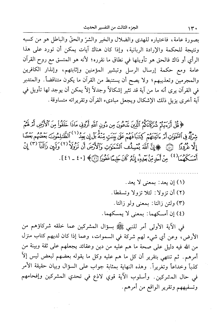 قُلْ أَرَأَيْتُمْ شُرَكاءَكُمُ الَّذِينَ تَدْعُونَ مِنْ دُونِ اللَّهِ أَرُونِي ماذا خَلَقُوا مِنَ الْأَرْضِ أَمْ لَهُمْ شِرْكٌ فِي السَّماواتِ أَمْ آتَيْناهُمْ كِتاباً فَهُمْ عَلى بَيِّنَةٍ مِنْهُ بَلْ إِنْ يَعِدُ الظَّالِمُونَ بَعْضُهُمْ بَعْضاً إِلاَّ غُرُوراً (40) إِنَّ اللَّهَ يُمْسِكُ السَّماواتِ وَالْأَرْضَ أَنْ تَزُولا وَلَئِنْ زالَتا إِنْ أَمْسَكَهُما مِنْ أَحَدٍ مِنْ بَعْدِهِ إِنَّهُ كانَ حَلِيماً غَفُوراً (41)