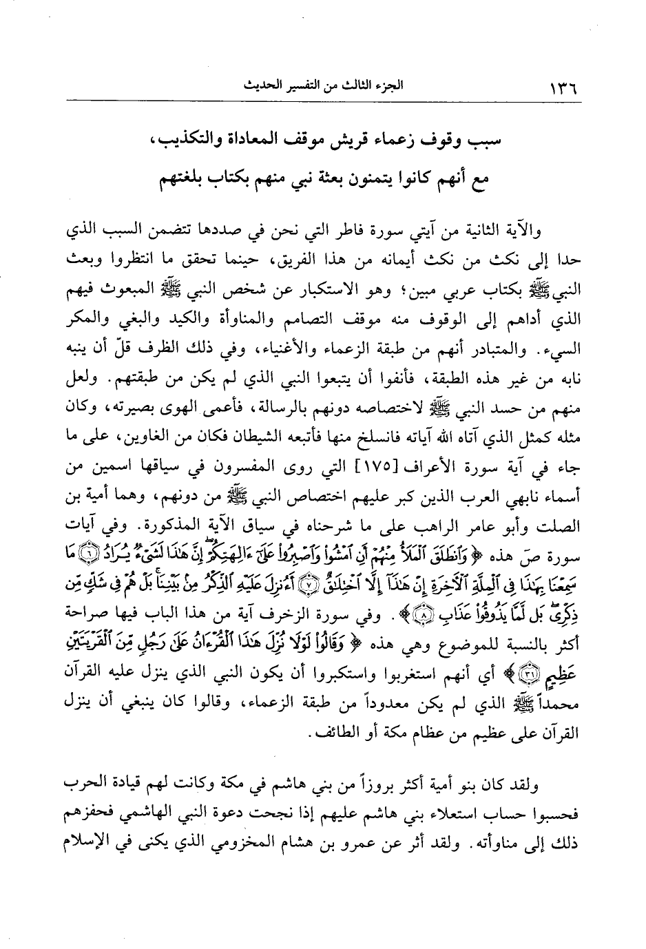والآية الثانية من آيتي سورة فاطر التي نحن في صددها تتضمن السبب الذي حدا إلى نكث من نكث أيمانه من هذا الفريق، حينما تحقق ما انتظروا وبعث النبي صلى الله عليه وسلم بكتاب عربي مبين وهو الاستكبار عن شخص النبي صلى الله عليه وسلم المبعوث فيهم الذي أداهم إلى الوقوف منه موقف التصامم والمناوأة والكيد والبغي والمكر السيء. والمتبادر أنهم من طبقة الزعماء والأغنياء، وفي ذلك الظرف قلّ أن ينبه نابه من غير هذه الطبقة، فأنفوا أن يتبعوا النبي الذي لم يكن من طبقتهم. ولعل منهم من حسد النبي صلى الله عليه وسلم لاختصاصه دونهم بالرسالة، فأعمى الهوى بصيرته، وكان مثله كمثل الذي آتاه الله آياته فانسلخ منها فأتبعه الشيطان فكان من الغاوين، على ما جاء في آية سورة الأعراف [175] التي روى المفسرون في سياقها اسمين من أسماء نابهي العرب الذين كبر عليهم اختصاص النبي صلى الله عليه وسلم من دونهم، وهما أمية بن الصلت وأبو عامر الراهب على ما شرحناه في سياق الآية المذكورة. وفي آيات سورة ص هذه وَانْطَلَقَ الْمَلَأُ مِنْهُمْ أَنِ امْشُوا وَاصْبِرُوا عَلى آلِهَتِكُمْ إِنَّ هذا لَشَيْءٌ يُرادُ (6) ما سَمِعْنا بِهذا فِي الْمِلَّةِ الْآخِرَةِ إِنْ هذا إِلَّا اخْتِلاقٌ (7) أَأُنْزِلَ عَلَيْهِ الذِّكْرُ مِنْ بَيْنِنا بَلْ هُمْ فِي شَكٍّ مِنْ ذِكْرِي بَلْ لَمَّا يَذُوقُوا عَذابِ (8) . وفي سورة الزخرف آية من هذا الباب فيها صراحة أكثر بالنسبة للموضوع وهي هذه وَقالُوا لَوْلا نُزِّلَ هذَا الْقُرْآنُ عَلى رَجُلٍ مِنَ الْقَرْيَتَيْنِ عَظِيمٍ (31) أي أنهم استغربوا واستكبروا أن يكون النبي الذي ينزل عليه القرآن محمدا صلى الله عليه وسلم الذي لم يكن معدودا من طبقة الزعماء، وقالوا كان ينبغي أن ينزل القرآن على عظيم من عظام مكة أو الطائف.