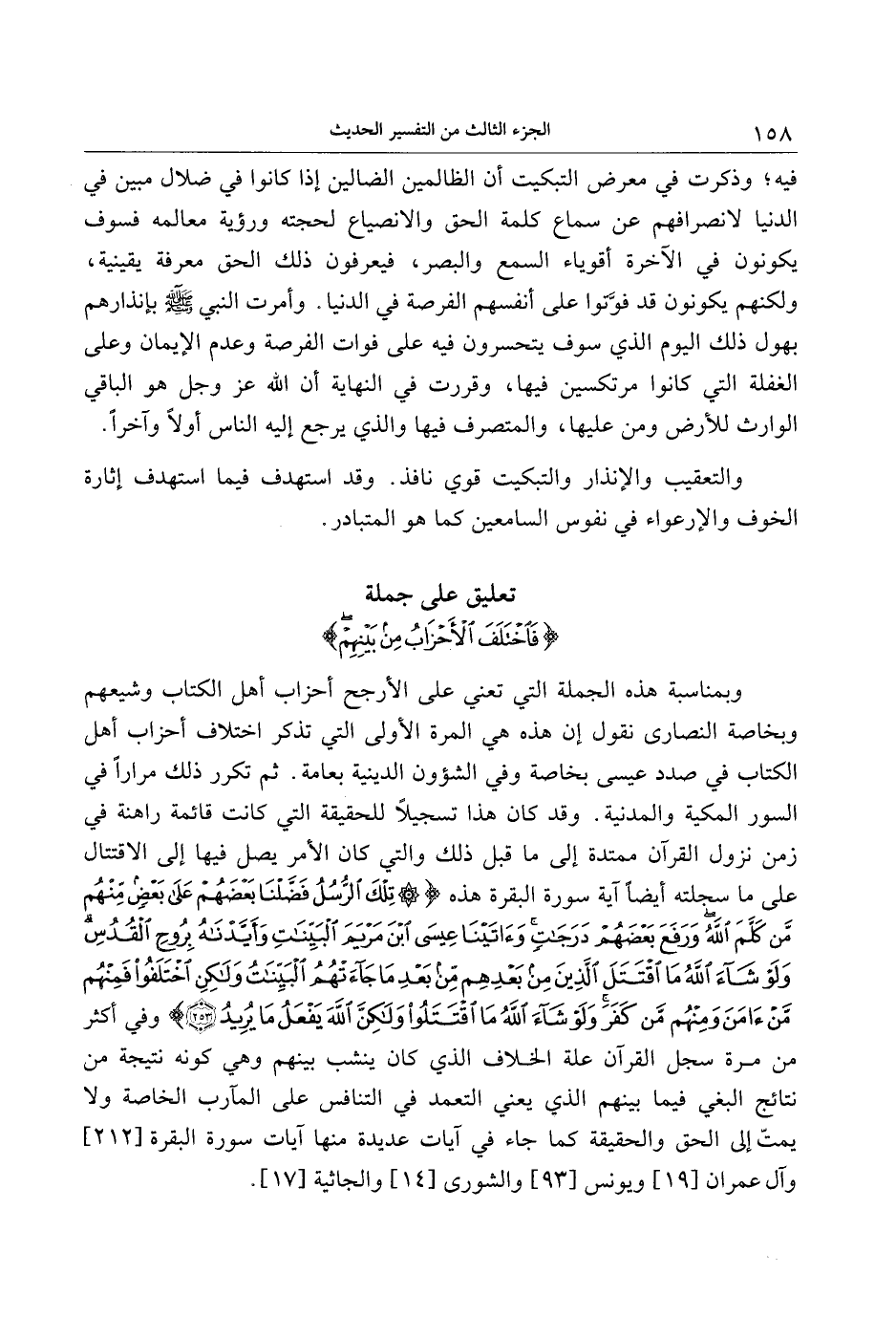وبمناسبة هذه الجملة التي تعني على الأرجح أحزاب أهل الكتاب وشيعهم وبخاصة النصارى نقول إن هذه هي المرة الأولى التي تذكر اختلاف أحزاب أهل الكتاب في صدد عيسى بخاصة وفي الشؤون الدينية بعامة. ثم تكرر ذلك مرارا في السور المكية والمدنية. وقد كان هذا تسجيلا للحقيقة التي كانت قائمة راهنة في زمن نزول القرآن ممتدة إلى ما قبل ذلك والتي كان الأمر يصل فيها إلى الاقتتال على ما سجلته أيضا آية سورة البقرة هذه تِلْكَ الرُّسُلُ فَضَّلْنا بَعْضَهُمْ عَلى بَعْضٍ مِنْهُمْ مَنْ كَلَّمَ اللَّهُ وَرَفَعَ بَعْضَهُمْ دَرَجاتٍ وَآتَيْنا عِيسَى ابْنَ مَرْيَمَ الْبَيِّناتِ وَأَيَّدْناهُ بِرُوحِ الْقُدُسِ وَلَوْ شاءَ اللَّهُ مَا اقْتَتَلَ الَّذِينَ مِنْ بَعْدِهِمْ مِنْ بَعْدِ ما جاءَتْهُمُ الْبَيِّناتُ وَلكِنِ اخْتَلَفُوا فَمِنْهُمْ مَنْ آمَنَ وَمِنْهُمْ مَنْ كَفَرَ وَلَوْ شاءَ اللَّهُ مَا اقْتَتَلُوا وَلكِنَّ اللَّهَ يَفْعَلُ ما يُرِيدُ (253) وفي أكثر من مرة سجل القرآن علة الخلاف الذي كان ينشب بينهم وهي كونه نتيجة من نتائج البغي فيما بينهم الذي يعني التعمد في التنافس على المآرب الخاصة ولا يمتّ إلى الحق والحقيقة كما جاء في آيات عديدة منها آيات سورة البقرة [212] وآل عمران [19] ويونس [93] والشورى [14] والجاثية [17] .