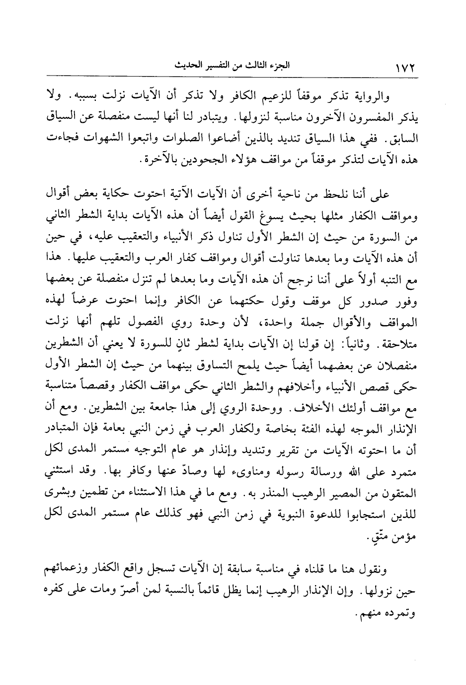 على أننا نلحظ من ناحية أخرى أن الآيات الآتية احتوت حكاية بعض أقوال ومواقف الكفار مثلها بحيث يسوغ القول أيضا أن هذه الآيات بداية الشطر الثاني من السورة من حيث إن الشطر الأول تناول ذكر الأنبياء والتعقيب عليه، في حين أن هذه الآيات وما بعدها تناولت أقوال ومواقف كفار العرب والتعقيب عليها. هذا مع التنبه أولا على أننا نرجح أن هذه الآيات وما بعدها لم تنزل منفصلة عن بعضها وفور صدور كل موقف وقول حكتهما عن الكافر وإنما احتوت عرضا لهذه المواقف والأقوال جملة واحدة، لأن وحدة روي الفصول تلهم أنها نزلت متلاحقة. وثانيا: إن قولنا إن الآيات بداية لشطر ثان للسورة لا يعني أن الشطرين منفصلان عن بعضهما أيضا حيث يلمح التساوق بينهما من حيث إن الشطر الأول حكى قصص الأنبياء وأخلافهم والشطر الثاني حكى مواقف الكفار وقصصا متناسبة مع مواقف أولئك الأخلاف. ووحدة الروي إلى هذا جامعة بين الشطرين. ومع أن الإنذار الموجه لهذه الفئة بخاصة ولكفار العرب في زمن النبي بعامة فإن المتبادر أن ما احتوته الآيات من تقرير وتنديد وإنذار هو عام التوجيه مستمر المدى لكل متمرد على الله ورسالة رسوله ومناوئ لها وصادّ عنها وكافر بها. وقد استثني المتقون من المصير الرهيب المنذر به. ومع ما في هذا الاستثناء من تطمين وبشرى للذين استجابوا للدعوة النبوية في زمن النبي فهو كذلك عام مستمر المدى لكل مؤمن متّق.