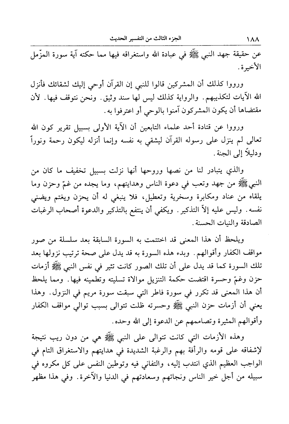 ويلحظ أن هذا المعنى قد اختتمت به السورة السابقة بعد سلسلة من صور مواقف الكفار وأقوالهم. وبدء هذه السورة به قد يدل على صحة ترتيب نزولها بعد تلك السورة كما قد يدل على أن تلك الصور كانت تثير في نفس النبي صلى الله عليه وسلم أزمات حزن وغمّ وحسرة اقتضت حكمة التنزيل موالاة تسليته وتطمينه فيها. ومما يلحظ أن هذا المعنى قد تكرر في سورة فاطر التي سبقت سورة مريم في النزول. وهذا يعني أن أزمات حزن النبي صلى الله عليه وسلم وحسرته ظلت تتوالى بسبب توالي مواقف الكفار وأقوالهم المثيرة وتصاممهم عن الدعوة إلى الله وحده.