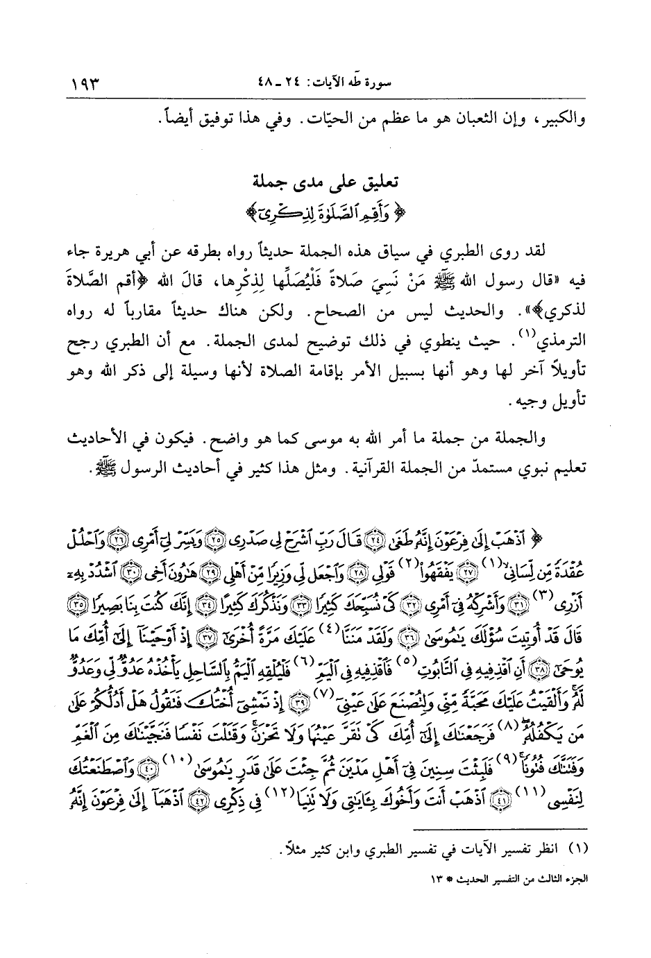 لقد روى الطبري في سياق هذه الجملة حديثا رواه بطرقه عن أبي هريرة جاء فيه «قال رسول الله صلى الله عليه وسلم من نسي صلاة فليصلّها لذكرها، قال الله أَقِمِ الصَّلاةَ لِذِكْرِي» (1) . والحديث ليس من الصحاح. ولكن هناك حديثا مقاربا له رواه الترمذي «1» . حيث ينطوي في ذلك توضيح لمدى الجملة. مع أن الطبري رجح تأويلا آخر لها وهو أنها بسبيل الأمر بإقامة الصلاة لأنها وسيلة إلى ذكر الله وهو تأويل وجيه.
