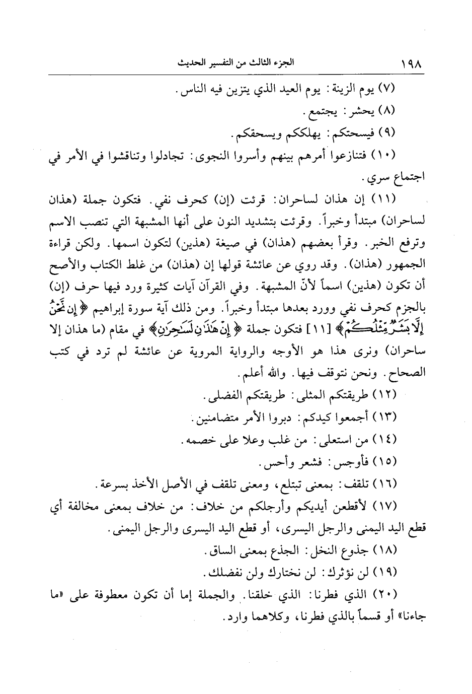 (11) إن هذان لساحران: قرئت (إن) كحرف نفي. فتكون جملة (هذان لساحران) مبتدأ وخبرا. وقرئت بتشديد النون على أنها المشبهة التي تنصب الاسم وترفع الخبر. وقرأ بعضهم (هذان) في صيغة (هذين) لتكون اسمها. ولكن قراءة الجمهور (هذان) . وقد روي عن عائشة قولها إن (هذان) من غلط الكتاب والأصح أن تكون (هذين) اسما لأنّ المشبهة. وفي القرآن آيات كثيرة ورد فيها حرف (إن) بالجزم كحرف نفي وورد بعدها مبتدأ وخبرا. ومن ذلك آية سورة إبراهيم إِنْ نَحْنُ إِلَّا بَشَرٌ مِثْلُكُمْ [11] فتكون جملة إِنْ هذانِ لَساحِرانِ في مقام (ما هذان إلا ساحران) ونرى هذا هو الأوجه والرواية المروية عن عائشة لم ترد في كتب الصحاح. ونحن نتوقف فيها. والله أعلم.