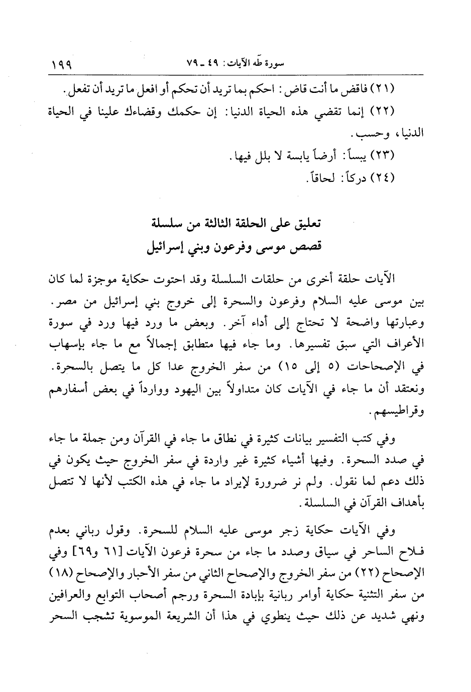 وفي كتب التفسير بيانات كثيرة في نطاق ما جاء في القرآن ومن جملة ما جاء في صدد السحرة. وفيها أشياء كثيرة غير واردة في سفر الخروج حيث يكون في ذلك دعم لما نقول. ولم نر ضرورة لإيراد ما جاء في هذه الكتب لأنها لا تتصل بأهداف القرآن في السلسلة.
