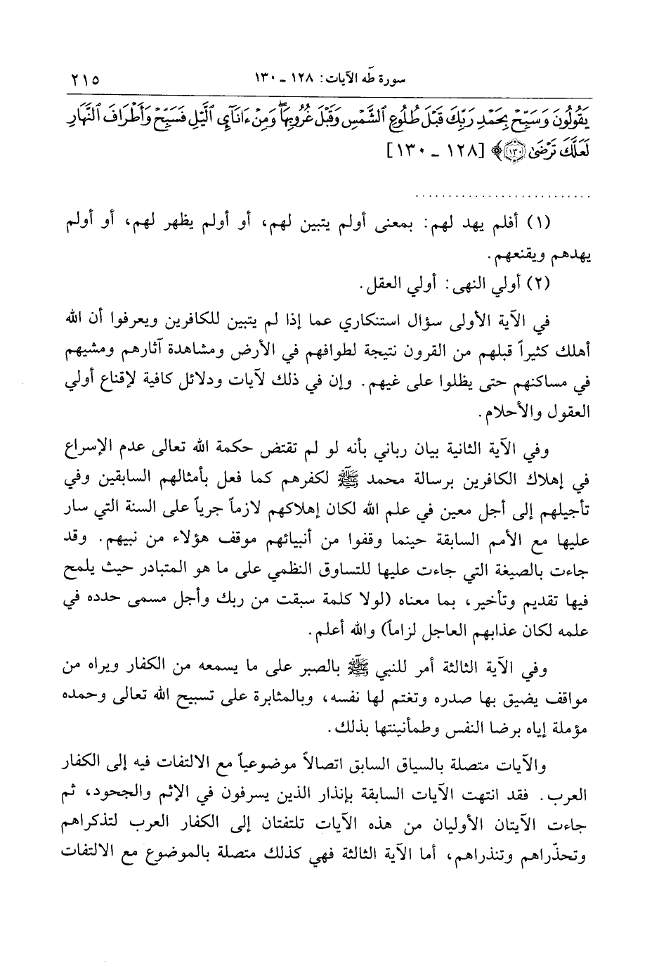 وفي الآية الثانية بيان رباني بأنه لو لم تقتض حكمة الله تعالى عدم الإسراع في إهلاك الكافرين برسالة محمد صلى الله عليه وسلم لكفرهم كما فعل بأمثالهم السابقين وفي تأجيلهم إلى أجل معين في علم الله لكان إهلاكهم لازما جريا على السنة التي سار عليها مع الأمم السابقة حينما وقفوا من أنبيائهم موقف هؤلاء من نبيهم. وقد جاءت بالصيغة التي جاءت عليها للتساوق النظمي على ما هو المتبادر حيث يلمح فيها تقديم وتأخير، بما معناه (لولا كلمة سبقت من ربك وأجل مسمى حدده في علمه لكان عذابهم العاجل لزاما) والله أعلم.