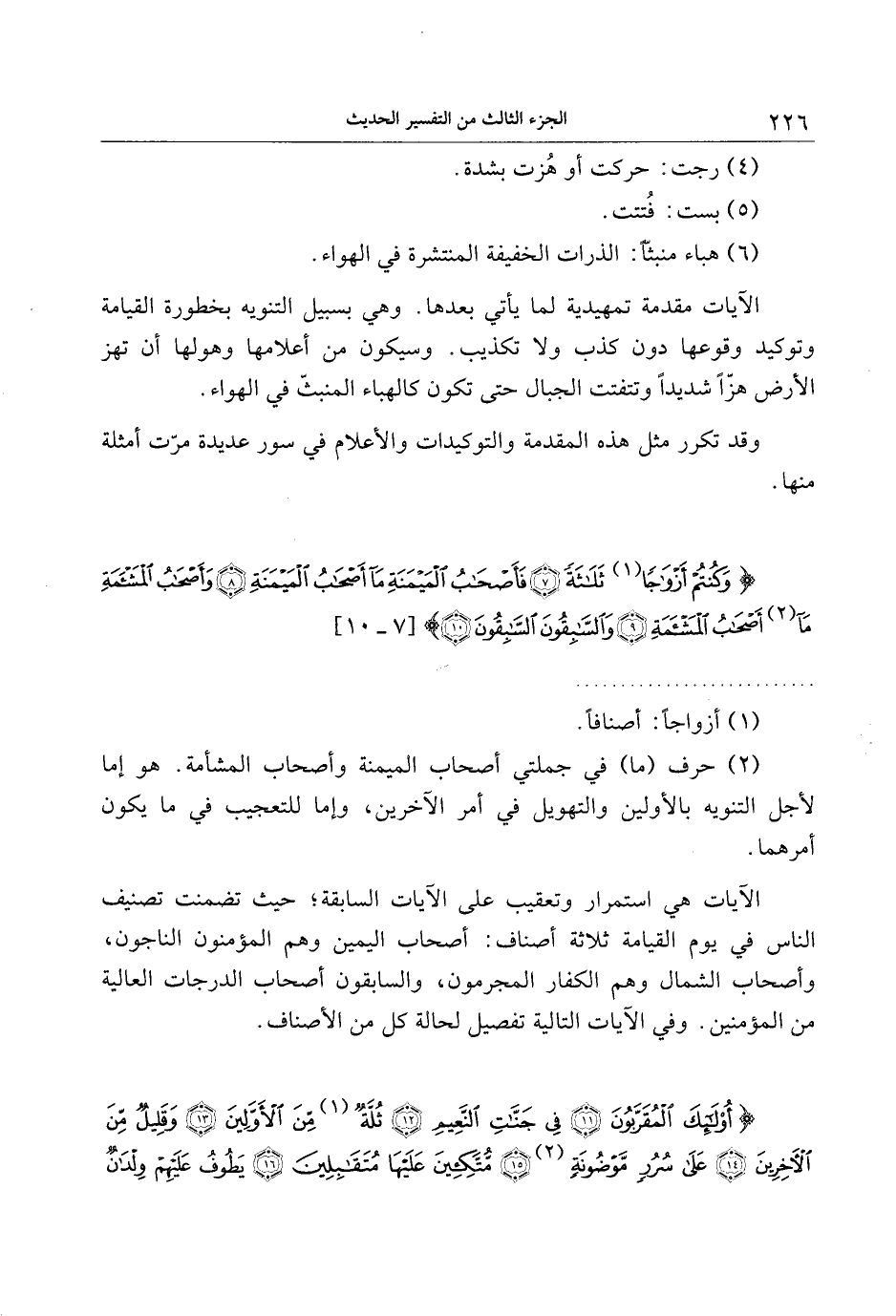 الآيات استمرار للسياق. وقد تضمنت وصف مصير السابقين. فهم المقربون الذين يتنعّمون في الآخرة بالنعيم العظيم المترف الذي وصف وصفا دائما أخّاذا