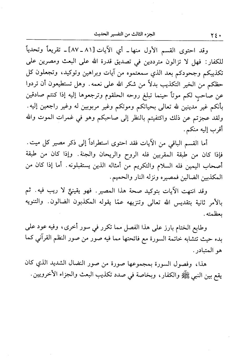 هذا، وفصول السورة بمجموعها صورة من صور النضال الشديد الذي كان يقع بين النبي صلى الله عليه وسلم والكفار، وبخاصة في صدد تكذيب البعث والجزاء الأخرويين.