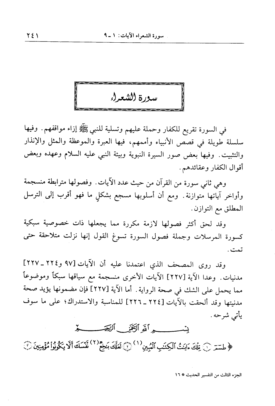 وقد روى المصحف الذي اعتمدنا عليه أن الآيات [97 و 224- 227] مدنيات. وعدا الآية [227] الآيات الأخرى منسجمة مع سياقها سبكا وموضوعا مما يحمل على الشك في صحة الرواية. أما الآية [227] فإن مضومنها يؤيد صحة مدنيتها وقد ألحقت بالآيات [224- 226] للمناسبة والاستدراك على ما سوف يأتي شرحه.