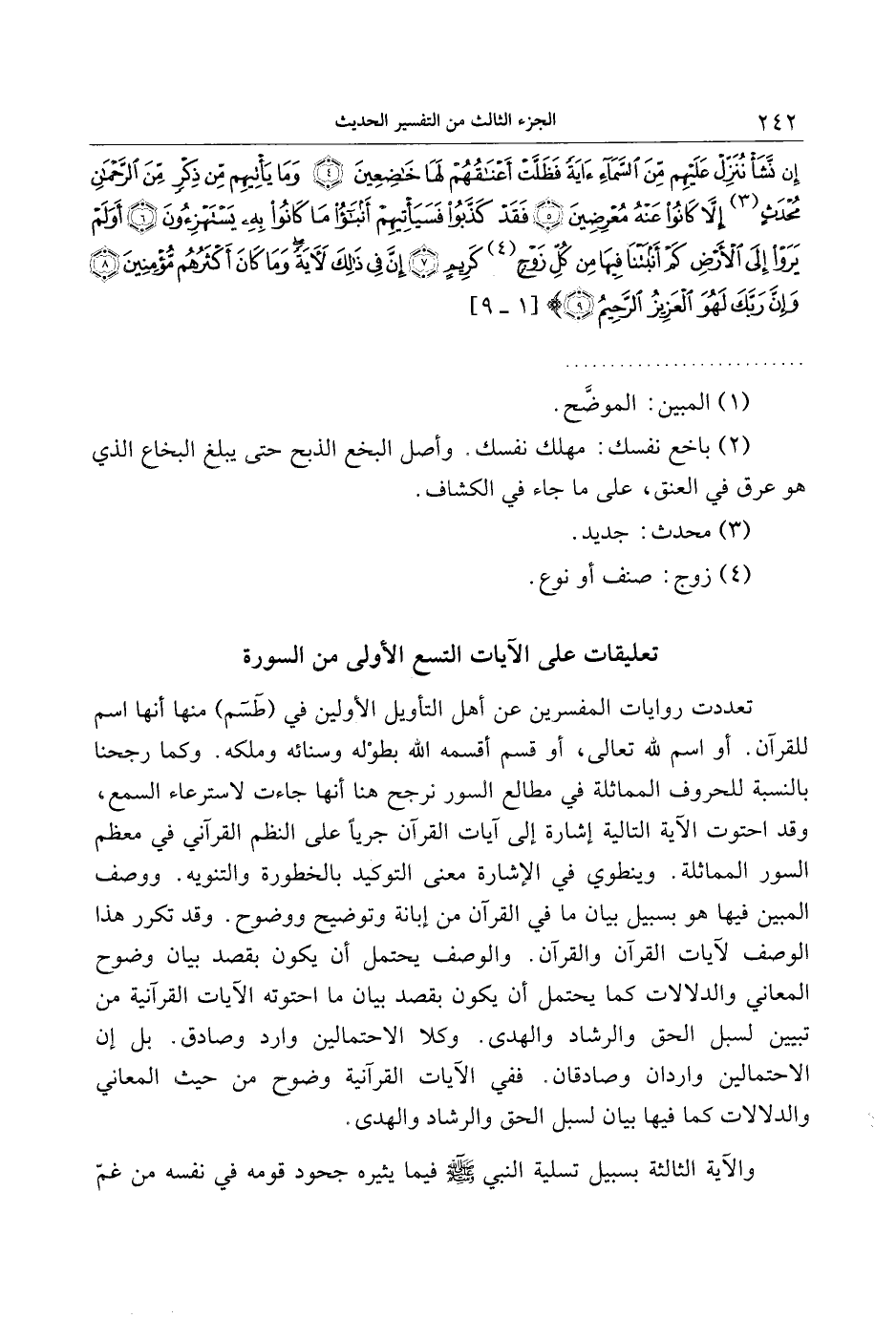 تعددت روايات المفسرين عن أهل التأويل الأولين في (طسم) منها أنها اسم للقرآن. أو اسم لله تعالى، أو قسم أقسمه الله بطوله وسنائه وملكه. وكما رجحنا بالنسبة للحروف المماثلة في مطالع السور نرجح هنا أنها جاءت لاسترعاء السمع، وقد احتوت الآية التالية إشارة إلى آيات القرآن جريا على النظم القرآني في معظم السور المماثلة. وينطوي في الإشارة معنى التوكيد بالخطورة والتنويه. ووصف المبين فيها هو بسبيل بيان ما في القرآن من إبانة وتوضيح ووضوح. وقد تكرر هذا الوصف لآيات القرآن والقرآن. والوصف يحتمل أن يكون بقصد بيان وضوح المعاني والدلالات كما يحتمل أن يكون بقصد بيان ما احتوته الآيات القرآنية من تبيين لسبل الحق والرشاد والهدى. وكلا الاحتمالين وارد وصادق. بل إن الاحتمالين واردان وصادقان. ففي الآيات القرآنية وضوح من حيث المعاني والدلالات كما فيها بيان لسبل الحق والرشاد والهدى.