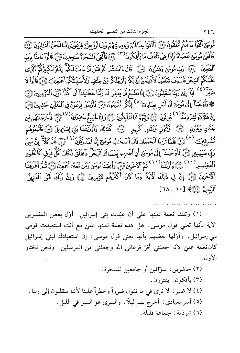 (1) وتلك نعمة تمنها علي أن عبّدت بني إسرائيل: أوّل بعض المفسرين الآية بأنها تعني قول موسى: هل هذه نعمة تمنها عليّ مع أنك استعبدت قومي بني إسرائيل. وأوّلها بعضهم بأنها تعني قول موسى: إن استعبادك لبني إسرائيل كان نعمة عليّ لأنه جعلني أفرّ فرعاني الله وجعلني من المرسلين. ونحن نختار الأول.