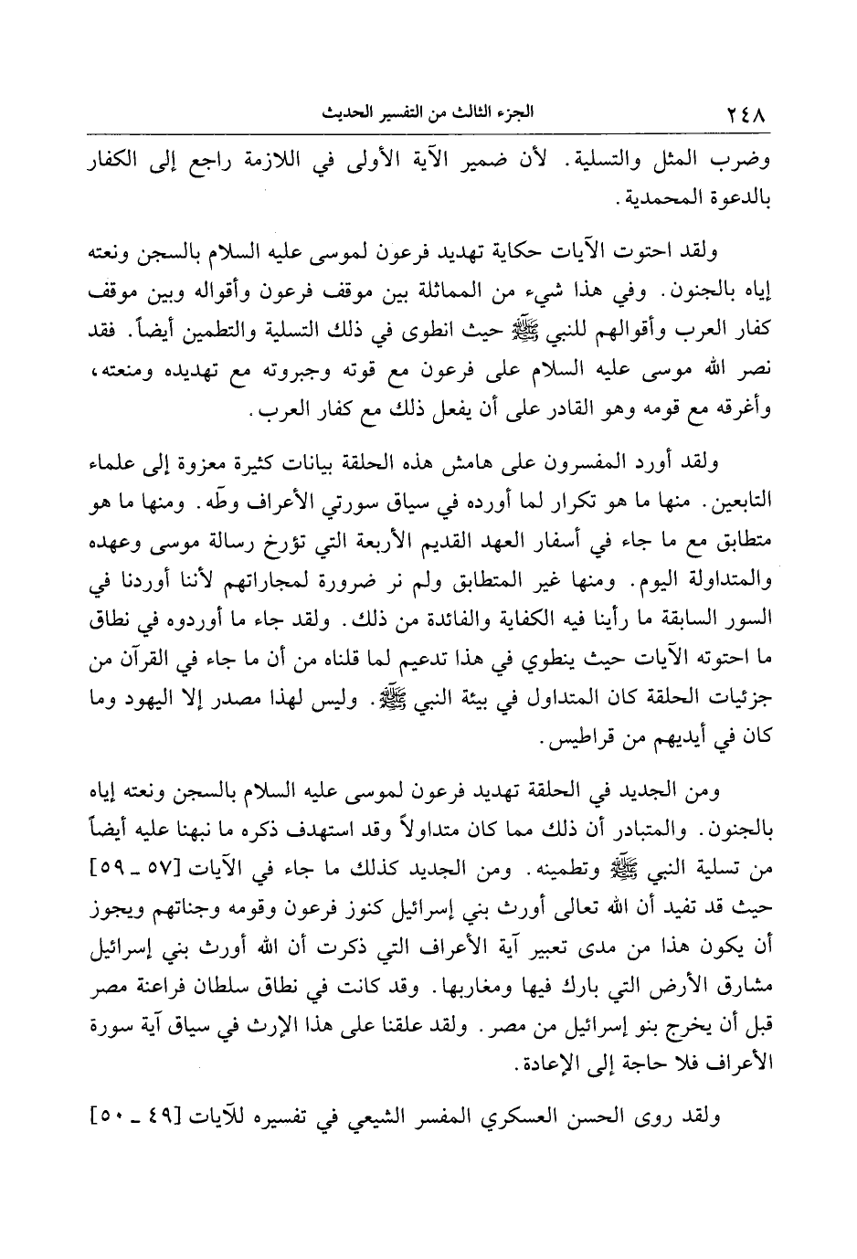 ولقد أورد المفسرون على هامش هذه الحلقة بيانات كثيرة معزوة إلى علماء التابعين. منها ما هو تكرار لما أورده في سياق سورتي الأعراف وطه. ومنها ما هو متطابق مع ما جاء في أسفار العهد القديم الأربعة التي تؤرخ رسالة موسى وعهده والمتداولة اليوم. ومنها غير المتطابق ولم نر ضرورة لمجاراتهم لأننا أوردنا في السور السابقة ما رأينا فيه الكفاية والفائدة من ذلك. ولقد جاء ما أوردوه في نطاق ما احتوته الآيات حيث ينطوي في هذا تدعيم لما قلناه من أن ما جاء في القرآن من جزئيات الحلقة كان المتداول في بيئة النبي صلى الله عليه وسلم. وليس لهذا مصدر إلا اليهود وما كان في أيديهم من قراطيس.