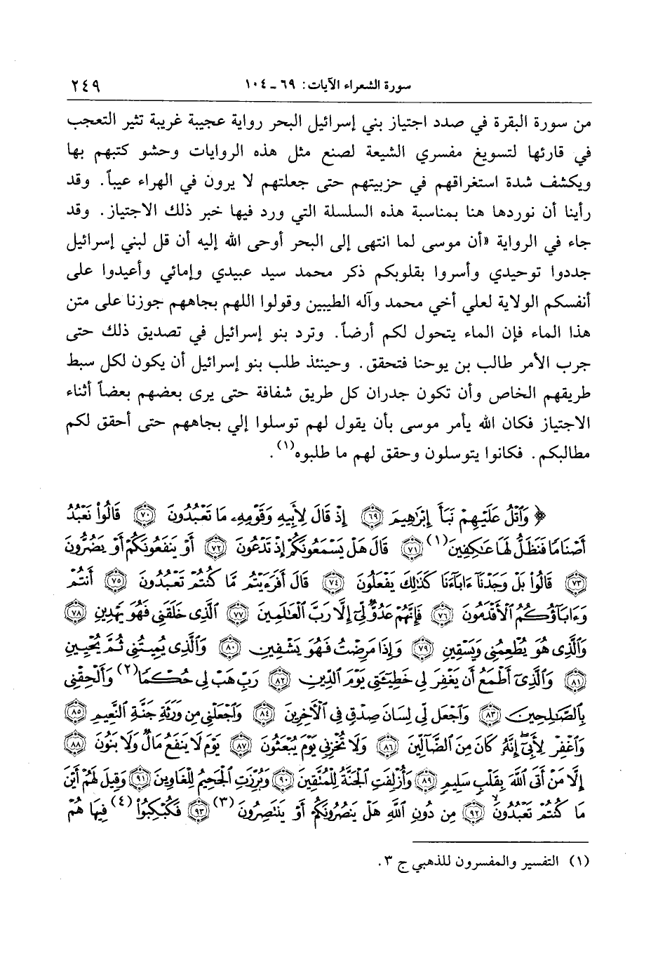 من سورة البقرة في صدد اجتياز بني إسرائيل البحر رواية عجيبة غريبة تثير التعجب في قارئها لتسويغ مفسري الشيعة لصنع مثل هذه الروايات وحشو كتبهم بها ويكشف شدة استغراقهم في حزبيتهم حتى جعلتهم لا يرون في الهراء عيبا. وقد رأينا أن نوردها هنا بمناسبة هذه السلسلة التي ورد فيها خبر ذلك الاجتياز. وقد جاء في الرواية «أن موسى لما انتهى إلى البحر أوحى الله إليه أن قل لبني إسرائيل جددوا توحيدي وأسروا بقلوبكم ذكر محمد سيد عبيدي وإمائي وأعيدوا على أنفسكم الولاية لعلي أخي محمد وآله الطيبين وقولوا اللهم بجاههم جوزنا على متن هذا الماء فإن الماء يتحول لكم أرضا. وترد بنو إسرائيل في تصديق ذلك حتى جرب الأمر طالب بن يوحنا فتحقق. وحينئذ طلب بنو إسرائيل أن يكون لكل سبط طريقهم الخاص وأن تكون جدران كل طريق شفافة حتى يرى بعضهم بعضا أثناء الاجتياز فكان الله يأمر موسى بأن يقول لهم توسلوا إلي بجاههم حتى أحقق لكم مطالبكم. فكانوا يتوسلون وحقق لهم ما طلبوه «1» .