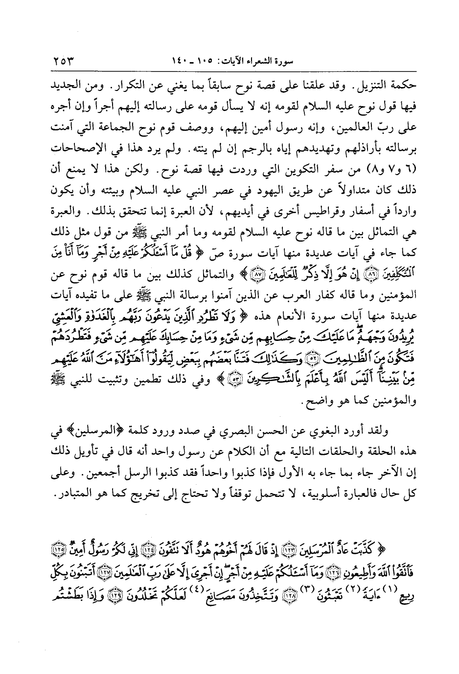 ولقد أورد البغوي عن الحسن البصري في صدد ورود كلمة الْمُرْسَلِينَ في هذه الحلقة والحلقات التالية مع أن الكلام عن رسول واحد أنه قال في تأويل ذلك إن الآخر جاء بما جاء به الأول فإذا كذبوا واحدا فقد كذبوا الرسل أجمعين. وعلى كل حال فالعبارة أسلوبية، لا تتحمل توقفا ولا تحتاج إلى تخريج كما هو المتبادر.