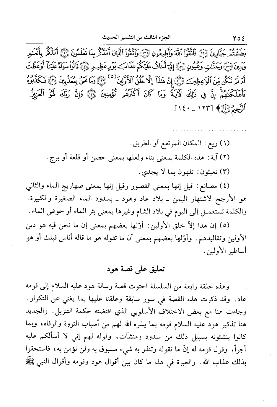 وجاءت هنا مع بعض الاختلاف الأسلوبي الذي اقتضته حكمة التنزيل. والجديد هنا تذكير هود عليه السلام قومه بما يسّره الله لهم من أسباب الثروة والرفاه، وبما كانوا ينشئونه بسبيل ذلك من سدود ومنشات، وقوله لهم إني لا أسألكم عليه أجرا، وقول قومه له إنّ ما تقوله وتنذر به شيء مسبوق به ولن نؤمن به، فاستحقوا بذلك عذاب الله. والعبرة في هذا ما كان بين أقوال هود وقومه وأقوال النبي صلى الله عليه وسلم