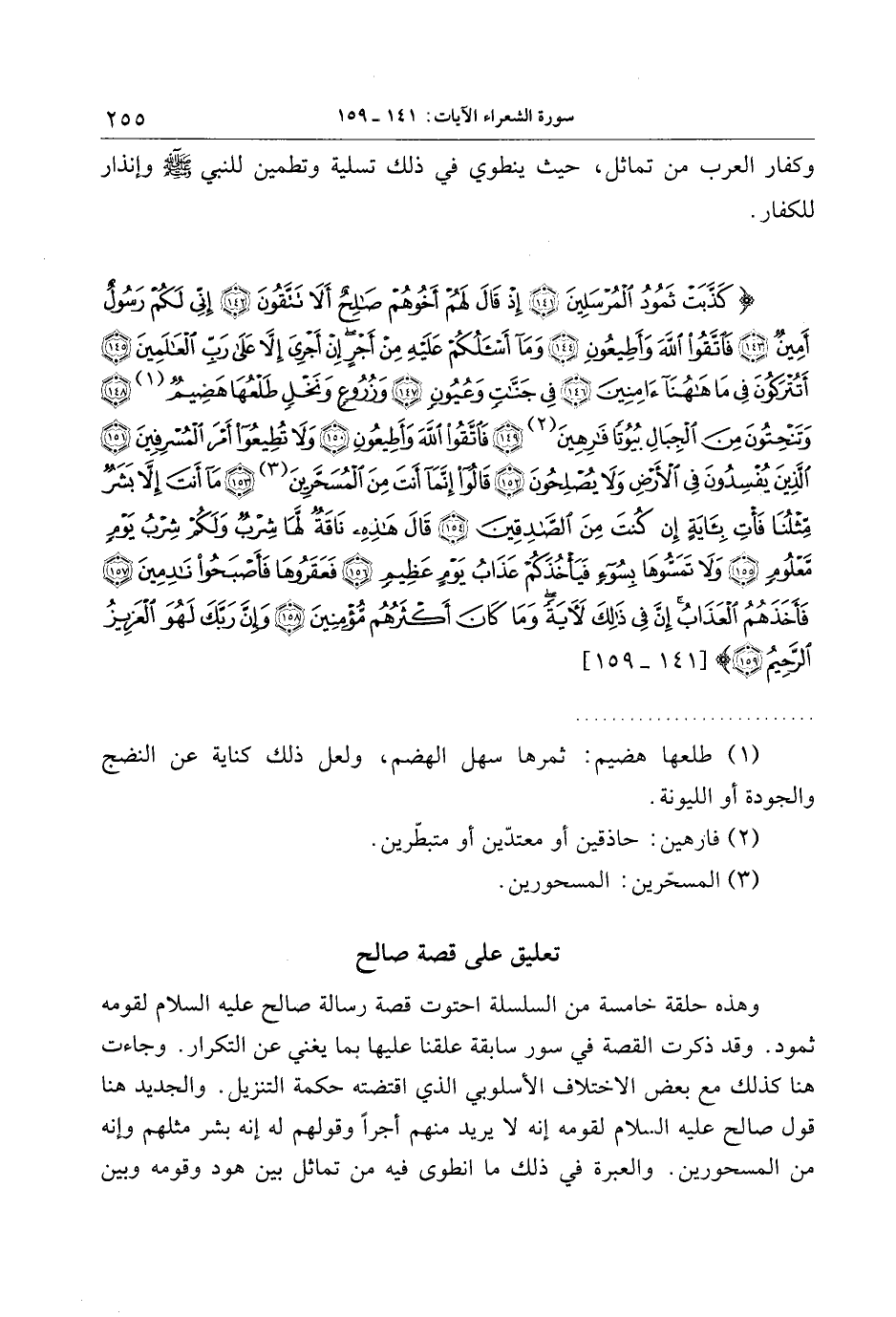 وهذه حلقة خامسة من السلسلة احتوت قصة رسالة صالح عليه السلام لقومه ثمود. وقد ذكرت القصة في سور سابقة علقنا عليها بما يغني عن التكرار. وجاءت هنا كذلك مع بعض الاختلاف الأسلوبي الذي اقتضته حكمة التنزيل. والجديد هنا قول صالح عليه السلام لقومه إنه لا يريد منهم أجرا وقولهم له إنه بشر مثلهم وإنه من المسحورين. والعبرة في ذلك ما انطوى فيه من تماثل بين هود وقومه وبين