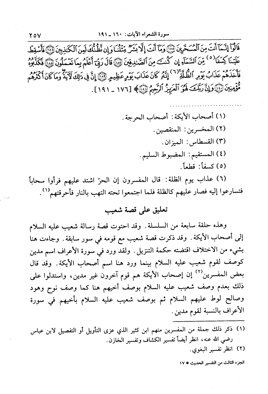 وهذه حلقة سابعة من السلسلة. وقد احتوت قصة رسالة شعيب عليه السلام إلى أصحاب الأيكة. وقد ذكرت قصة شعيب مع قومه في سور سابقة. وجاءت هنا بشيء من الاختلاف اقتضته حكمة التنزيل. ولقد ورد في سورة الأعراف اسم مدين كوصف لقوم شعيب عليه السلام بينما ورد هنا اسم أصحاب الأيكة. وقد قال بعض المفسرين «2» إن أصحاب الأيكة هم قوم آخرون غير مدين، واستدلوا على ذلك بعدم وصف شعيب عليه السلام بوصف أخيهم هنا كما وصف نوح وهود وصالح لوط عليهم السلام ثم بوصف شعيب عليه السلام بأخيهم في سورة الأعراف بالنسبة لقوم مدين.