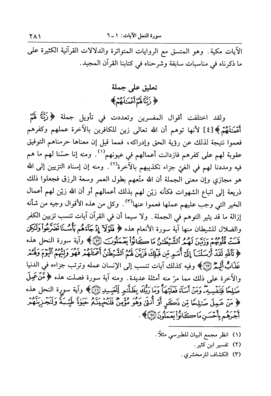 ولقد اختلفت أقوال المفسرين وتعددت في تأويل جملة زَيَّنَّا لَهُمْ أَعْمالَهُمْ [4] لأنها توهم أن الله تعالى زين للكافرين بالآخرة عملهم وكفرهم فعموا نتيجة لذلك عن رؤية الحق وإدراكه، فمما قيل إن معناها حرمناهم التوفيق عقوبة لهم على كفرهم فازدانت أعمالهم في عيونهم «1» . ومنه إنا حسّنا لهم ما هم فيه ومددنا لهم في الغيّ جزاء تكذيبهم بالآخرة «2» . ومنه إن إسناد التزيين إلى الله هو مجازي وإن معنى الجملة أن الله متّعهم بطول العمر وسعة الرزق فجعلوا ذلك ذريعة إلى اتباع الشهوات فكأنه زيّن لهم بذلك أعمالهم أو أن الله زيّن لهم أعمال الخير التي وجب عليهم عملها فعموا عنها «3» . وكل من هذه الأقوال وجيه من شأنه إزالة ما قد يثير التوهم في الجملة. ولا سيما أن في القرآن آيات تنسب تزيين الكفر والضلال للشيطان منها آية سورة الأنعام هذه فَلَوْلا إِذْ جاءَهُمْ بَأْسُنا تَضَرَّعُوا وَلكِنْ قَسَتْ قُلُوبُهُمْ وَزَيَّنَ لَهُمُ الشَّيْطانُ ما كانُوا يَعْمَلُونَ (43) وآية سورة النحل هذه تَاللَّهِ لَقَدْ أَرْسَلْنا إِلى أُمَمٍ مِنْ قَبْلِكَ فَزَيَّنَ لَهُمُ الشَّيْطانُ أَعْمالَهُمْ فَهُوَ وَلِيُّهُمُ الْيَوْمَ وَلَهُمْ عَذابٌ أَلِيمٌ (63) وفيه كذلك آيات تنسب إلى الإنسان عمله وترتب جزاءه في الدنيا والآخرة على ذلك مما مرّ منه أمثلة عديدة. ومنه آية سورة فصلت هذه مَنْ عَمِلَ صالِحاً فَلِنَفْسِهِ وَمَنْ أَساءَ فَعَلَيْها وَما رَبُّكَ بِظَلَّامٍ لِلْعَبِيدِ (46) وآية سورة النحل هذه مَنْ عَمِلَ صالِحاً مِنْ ذَكَرٍ أَوْ أُنْثى وَهُوَ مُؤْمِنٌ فَلَنُحْيِيَنَّهُ حَياةً طَيِّبَةً وَلَنَجْزِيَنَّهُمْ أَجْرَهُمْ بِأَحْسَنِ ما كانُوا يَعْمَلُونَ (97) .