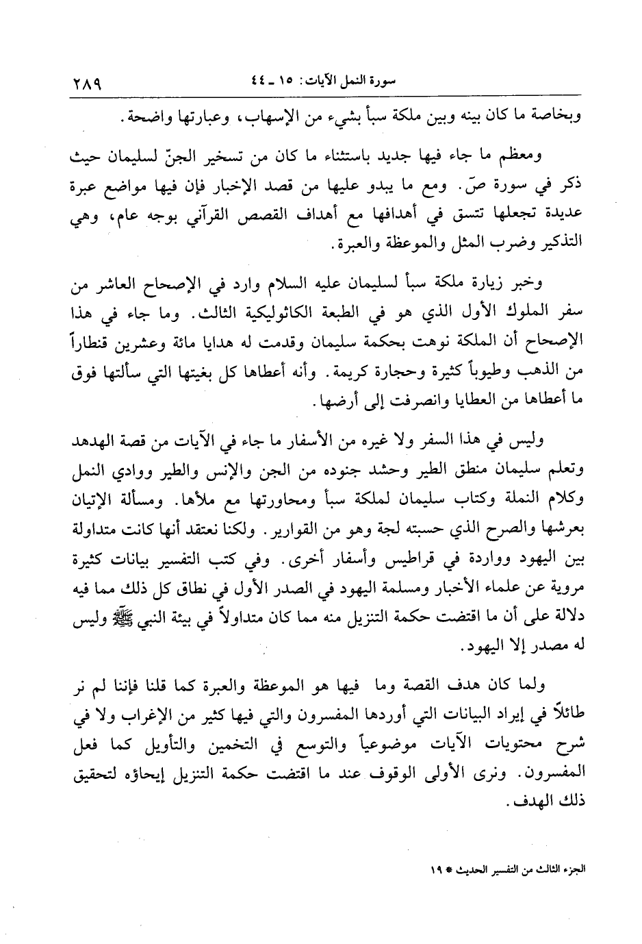 وليس في هذا السفر ولا غيره من الأسفار ما جاء في الآيات من قصة الهدهد وتعلم سليمان منطق الطير وحشد جنوده من الجن والإنس والطير ووادي النمل وكلام النملة وكتاب سليمان لملكة سبأ ومحاورتها مع ملأها. ومسألة الإتيان بعرشها والصرح الذي حسبته لجة وهو من القوارير. ولكنا نعتقد أنها كانت متداولة بين اليهود وواردة في قراطيس وأسفار أخرى. وفي كتب التفسير بيانات كثيرة مروية عن علماء الأخبار ومسلمة اليهود في الصدر الأول في نطاق كل ذلك مما فيه دلالة على أن ما اقتضت حكمة التنزيل منه مما كان متداولا في بيئة النبي صلى الله عليه وسلم وليس له مصدر إلا اليهود.