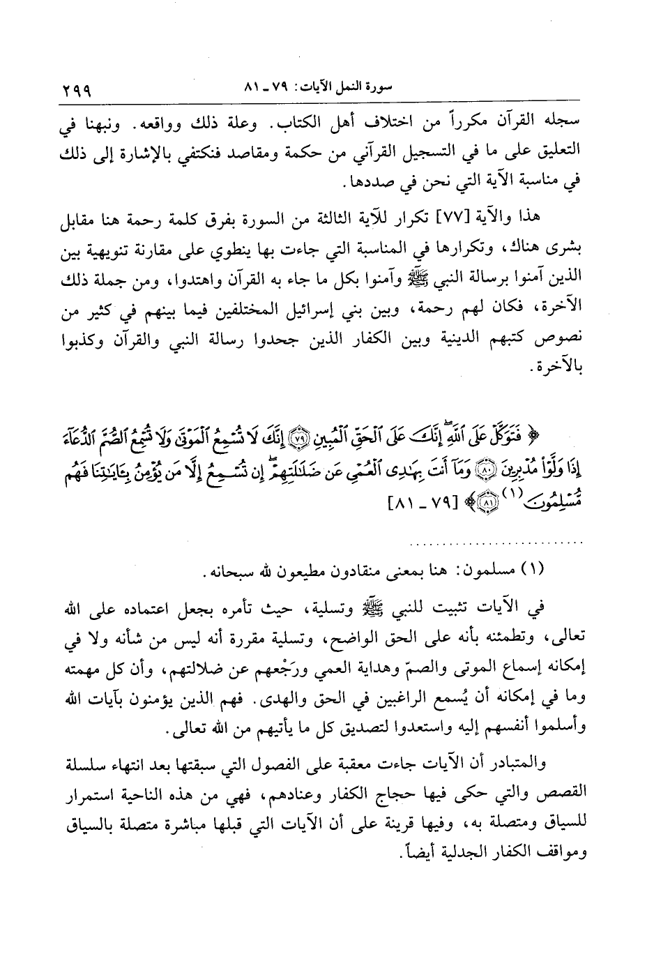 فَتَوَكَّلْ عَلَى اللَّهِ إِنَّكَ عَلَى الْحَقِّ الْمُبِينِ (79) إِنَّكَ لا تُسْمِعُ الْمَوْتى وَلا تُسْمِعُ الصُّمَّ الدُّعاءَ إِذا وَلَّوْا مُدْبِرِينَ (80) وَما أَنْتَ بِهادِي الْعُمْيِ عَنْ ضَلالَتِهِمْ إِنْ تُسْمِعُ إِلاَّ مَنْ يُؤْمِنُ بِآياتِنا فَهُمْ مُسْلِمُونَ (81)