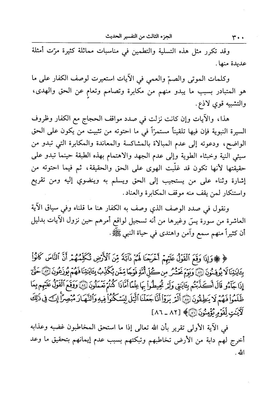وَإِذا وَقَعَ الْقَوْلُ عَلَيْهِمْ أَخْرَجْنا لَهُمْ دَابَّةً مِنَ الْأَرْضِ تُكَلِّمُهُمْ أَنَّ النَّاسَ كانُوا بِآياتِنا لا يُوقِنُونَ (82) وَيَوْمَ نَحْشُرُ مِنْ كُلِّ أُمَّةٍ فَوْجاً مِمَّنْ يُكَذِّبُ بِآياتِنا فَهُمْ يُوزَعُونَ (83) حَتَّى إِذا جاؤُ قالَ أَكَذَّبْتُمْ بِآياتِي وَلَمْ تُحِيطُوا بِها عِلْماً أَمَّا ذا كُنْتُمْ تَعْمَلُونَ (84) وَوَقَعَ الْقَوْلُ عَلَيْهِمْ بِما ظَلَمُوا فَهُمْ لا يَنْطِقُونَ (85) أَلَمْ يَرَوْا أَنَّا جَعَلْنَا اللَّيْلَ لِيَسْكُنُوا فِيهِ وَالنَّهارَ مُبْصِراً إِنَّ فِي ذلِكَ لَآياتٍ لِقَوْمٍ يُؤْمِنُونَ (86)