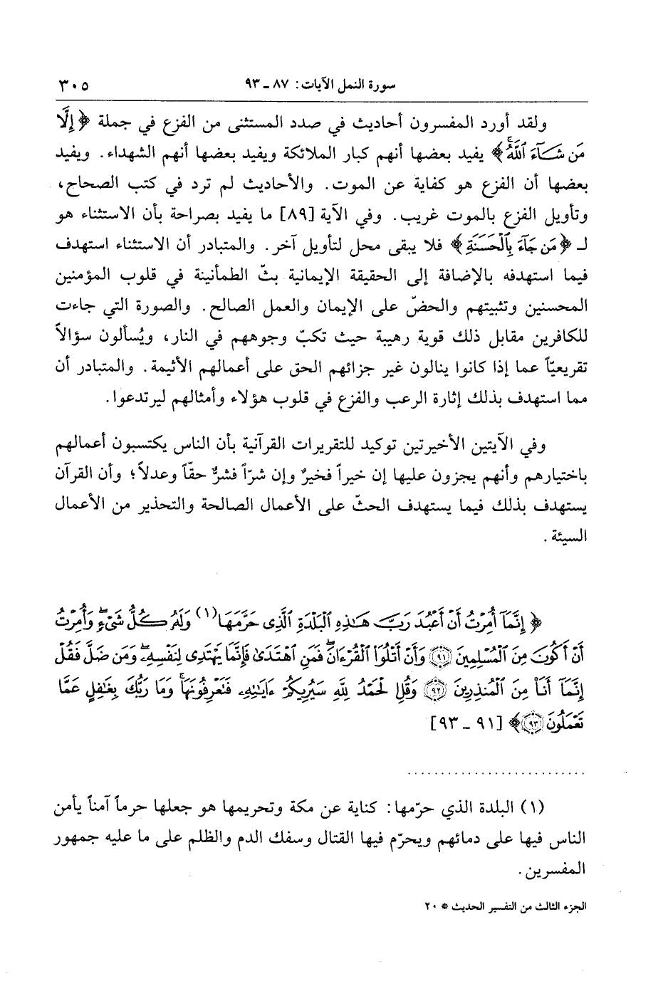 إِنَّما أُمِرْتُ أَنْ أَعْبُدَ رَبَّ هذِهِ الْبَلْدَةِ الَّذِي حَرَّمَها وَلَهُ كُلُّ شَيْءٍ وَأُمِرْتُ أَنْ أَكُونَ مِنَ الْمُسْلِمِينَ (91) وَأَنْ أَتْلُوَا الْقُرْآنَ فَمَنِ اهْتَدى فَإِنَّما يَهْتَدِي لِنَفْسِهِ وَمَنْ ضَلَّ فَقُلْ إِنَّما أَنَا مِنَ الْمُنْذِرِينَ (92) وَقُلِ الْحَمْدُ لِلَّهِ سَيُرِيكُمْ آياتِهِ فَتَعْرِفُونَها وَما رَبُّكَ بِغافِلٍ عَمَّا تَعْمَلُونَ (93)