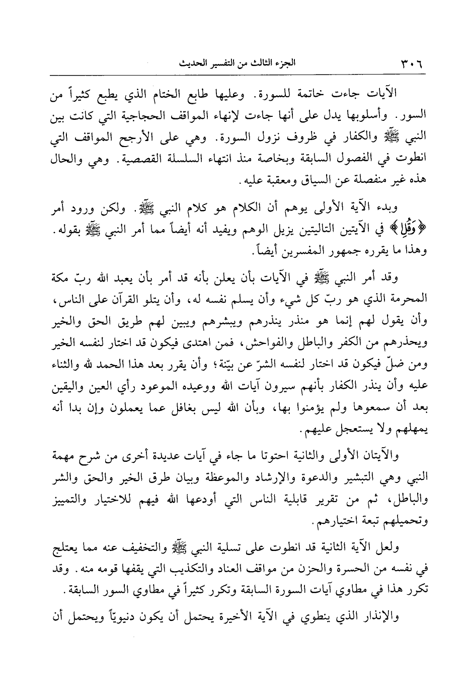 وقد أمر النبي صلى الله عليه وسلم في الآيات بأن يعلن بأنه قد أمر بأن يعبد الله ربّ مكة المحرمة الذي هو ربّ كل شيء وأن يسلم نفسه له، وأن يتلوا القرآن على الناس، وأن يقول لهم إنما هو منذر ينذرهم ويبشرهم ويبين لهم طريق الحق والخير ويحذرهم من الكفر والباطل والفواحش، فمن اهتدى فيكون قد اختار لنفسه الخير ومن ضلّ فيكون قد اختار لنفسه الشرّ عن بيّنة وأن يقرر بعد هذا الحمد لله والثناء عليه وأن ينذر الكفار بأنهم سيرون آيات الله ووعيده الموعود رأي العين واليقين بعد أن سمعوها ولم يؤمنوا بها، وبأن الله ليس بغافل عما يعملون وإن بدا أنه يمهلهم ولا يستعجل عليهم.