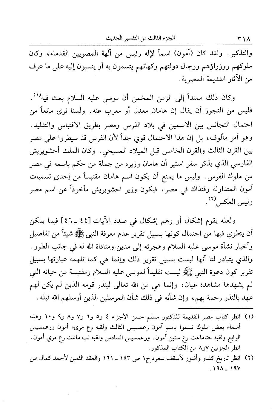 ولعله يقوم إشكال أو وهم إشكال في صدد الآيات [44- 46] فيما يمكن أن ينطوي فيها من احتمال كونها بسبيل تقرير عدم معرفة النبي صلى الله عليه وسلم شيئا من تفاصيل وأخبار نشأة موسى عليه السلام وهجرته إلى مدين ومناداة الله له في جانب الطور.