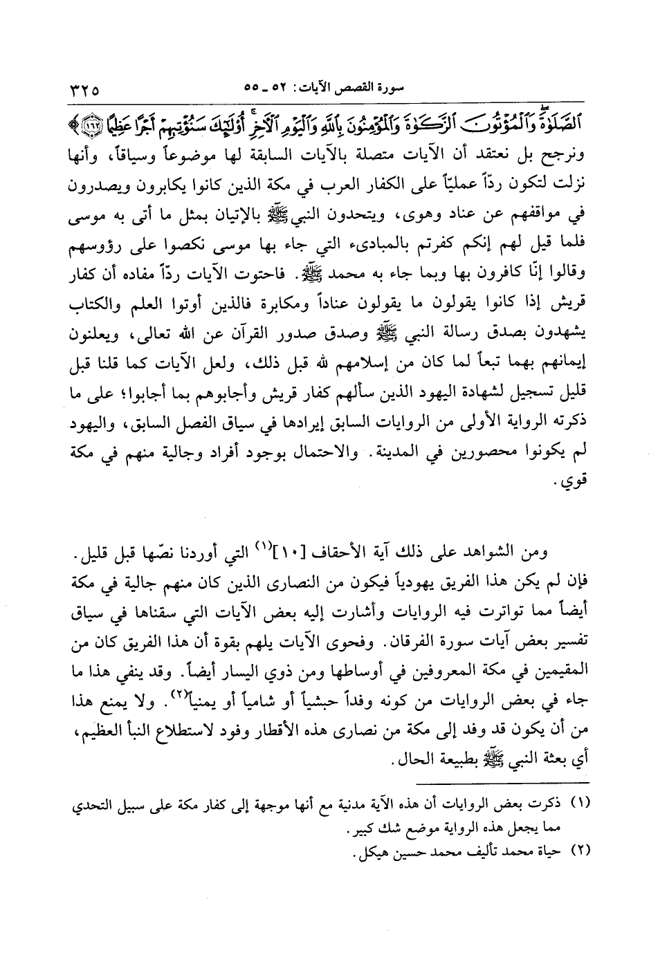 الصَّلاةَ وَالْمُؤْتُونَ الزَّكاةَ وَالْمُؤْمِنُونَ بِاللَّهِ وَالْيَوْمِ الْآخِرِ أُولئِكَ سَنُؤْتِيهِمْ أَجْراً عَظِيماً (162) ونرجح بل نعتقد أن الآيات متصلة بالآيات السابقة لها موضوعا وسياقا، وأنها نزلت لتكون ردّا عمليّا على الكفار العرب في مكة الذين كانوا يكابرون ويصدرون في مواقفهم عن عناد وهوى، ويتحدون النبي صلى الله عليه وسلم بالإتيان بمثل ما أتى به موسى فلما قيل لهم إنكم كفرتم بالمبادئ التي جاء بها موسى نكصوا على رؤوسهم وقالوا إنّا كافرون بها وبما جاء به محمد صلى الله عليه وسلم. فاحتوت الآيات ردّا مفاده أن كفار قريش إذا كانوا يقولون ما يقولون عنادا ومكابرة فالذين أوتوا العلم والكتاب يشهدون بصدق رسالة النبي صلى الله عليه وسلم وصدق صدور القرآن عن الله تعالى، ويعلنون إيمانهم بهما تبعا لما كان من إسلامهم لله قبل ذلك، ولعل الآيات كما قلنا قبل قليل تسجيل لشهادة اليهود الذين سألهم كفار قريش وأجابوهم بما أجابوا على ما ذكرته الرواية الأولى من الروايات السابق إيرادها في سياق الفصل السابق، واليهود لم يكونوا محصورين في المدينة. والاحتمال بوجود أفراد وجالية منهم في مكة قوي.
