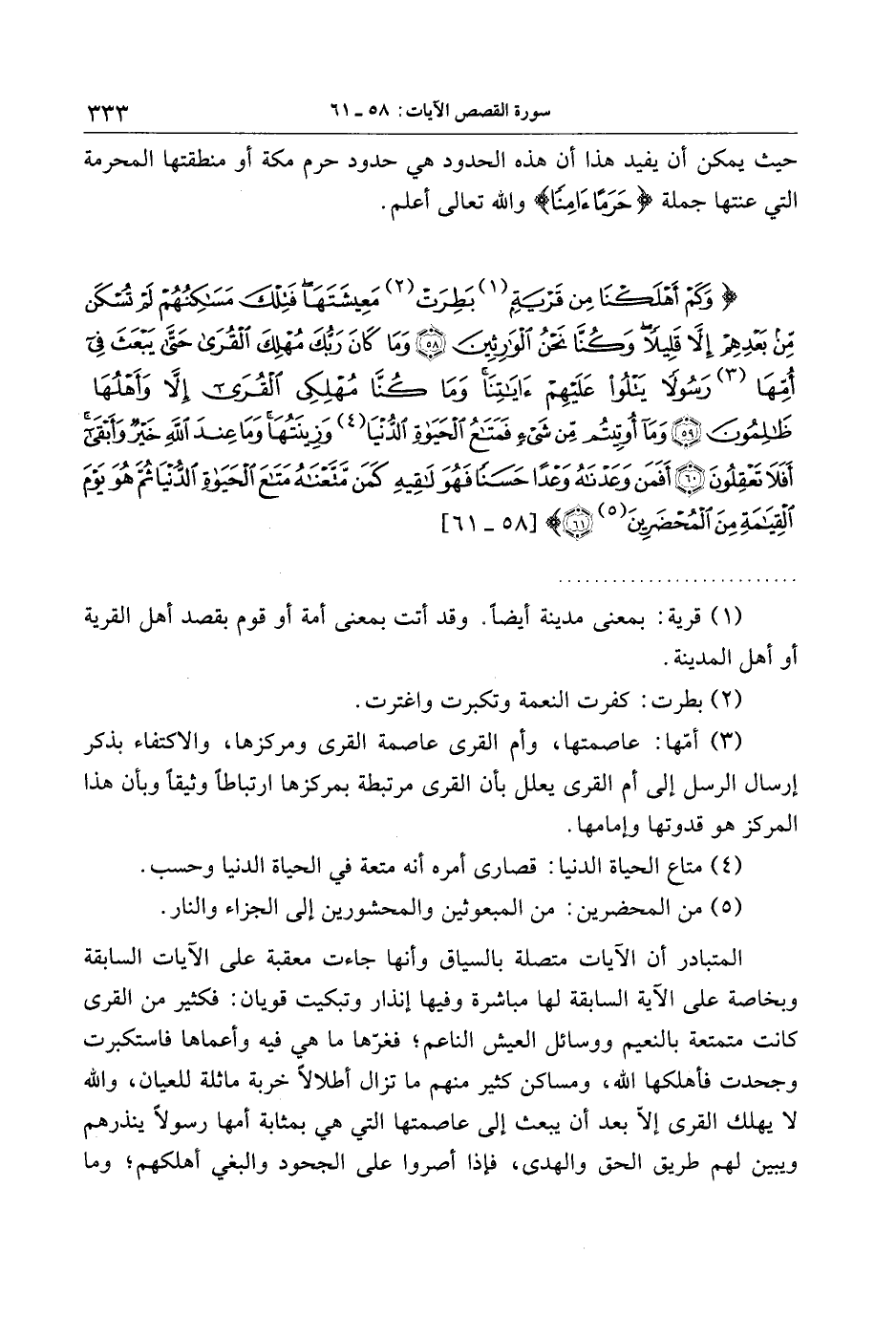 وَكَمْ أَهْلَكْنا مِنْ قَرْيَةٍ بَطِرَتْ مَعِيشَتَها فَتِلْكَ مَساكِنُهُمْ لَمْ تُسْكَنْ مِنْ بَعْدِهِمْ إِلاَّ قَلِيلاً وَكُنَّا نَحْنُ الْوارِثِينَ (58) وَما كانَ رَبُّكَ مُهْلِكَ الْقُرى حَتَّى يَبْعَثَ فِي أُمِّها رَسُولاً يَتْلُوا عَلَيْهِمْ آياتِنا وَما كُنَّا مُهْلِكِي الْقُرى إِلاَّ وَأَهْلُها ظالِمُونَ (59) وَما أُوتِيتُمْ مِنْ شَيْءٍ فَمَتاعُ الْحَياةِ الدُّنْيا وَزِينَتُها وَما عِنْدَ اللَّهِ خَيْرٌ وَأَبْقى أَفَلا تَعْقِلُونَ (60) أَفَمَنْ وَعَدْناهُ وَعْداً حَسَناً فَهُوَ لاقِيهِ كَمَنْ مَتَّعْناهُ مَتاعَ الْحَياةِ الدُّنْيا ثُمَّ هُوَ يَوْمَ الْقِيامَةِ مِنَ الْمُحْضَرِينَ (61)