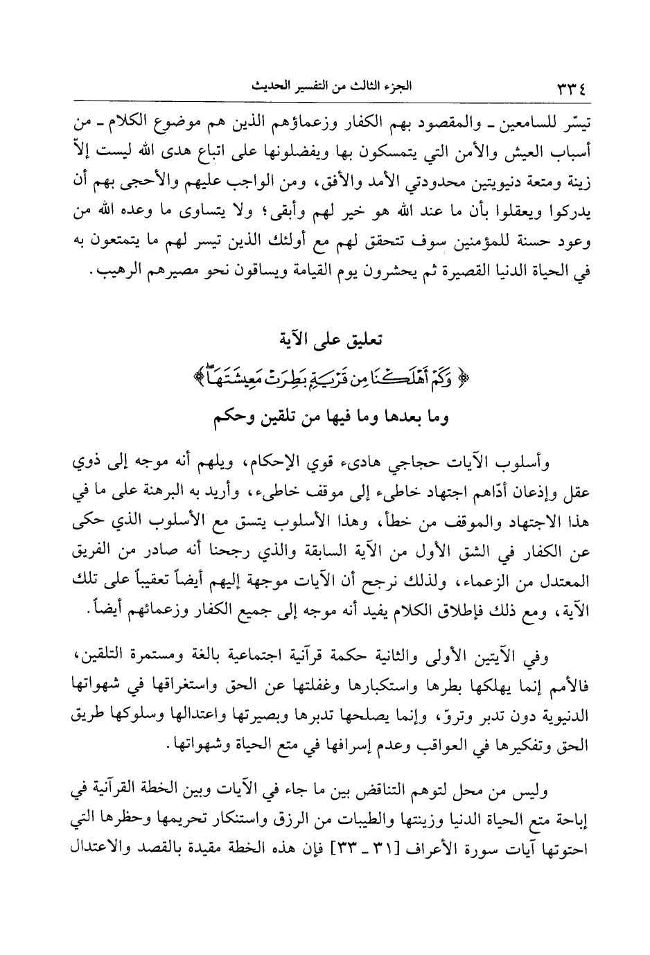 تعليق على الآية وَكَمْ أَهْلَكْنا مِنْ قَرْيَةٍ بَطِرَتْ مَعِيشَتَها وما بعدها وما فيها من تلقين وحكم