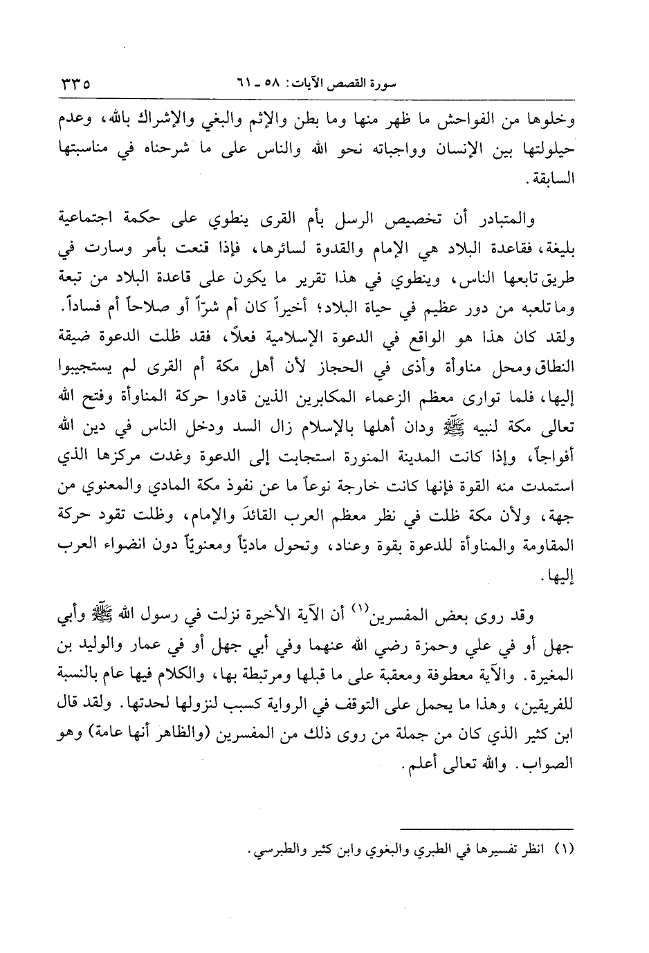 والمتبادر أن تخصيص الرسل بأم القرى ينطوي على حكمة اجتماعية بليغة، فقاعدة البلاد هي الإمام والقدوة لسائرها، فإذا قنعت بأمر وسارت في طريق تابعها الناس، وينطوي في هذا تقرير ما يكون على قاعدة البلاد من تبعة وما تلعبه من دور عظيم في حياة البلاد أخيرا كان أم شرّا أو صلاحا أم فسادا.