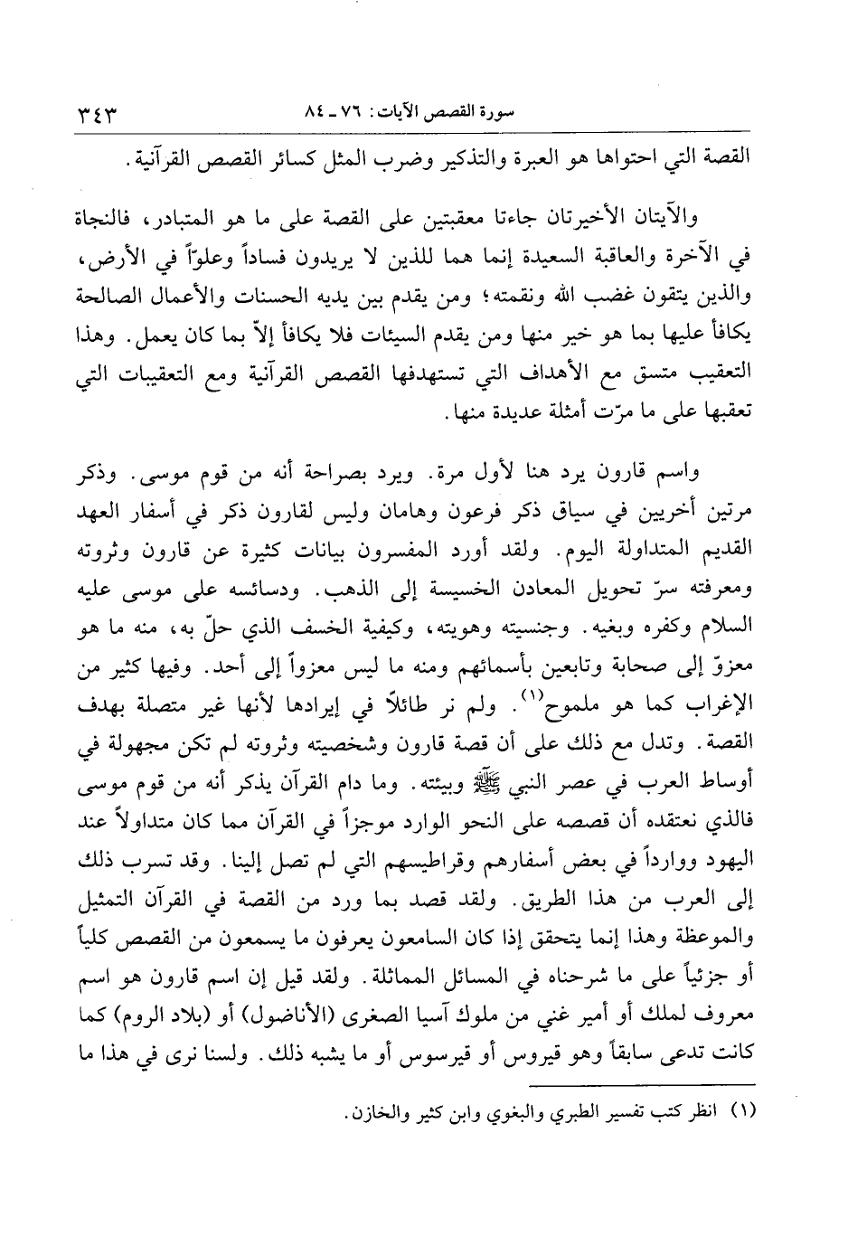 واسم قارون يرد هنا لأول مرة. ويرد بصراحة أنه من قوم موسى. وذكر مرتين أخريين في سياق ذكر فرعون وهامان وليس لقارون ذكر في أسفار العهد القديم المتداولة اليوم. ولقد أورد المفسرون بيانات كثيرة عن قارون وثروته ومعرفته سرّ تحويل المعادن الخسيسة إلى الذهب. ودسائسه على موسى عليه السلام وكفره وبغيه. وجنسيته وهويته، وكيفية الخسف الذي حلّ به، منه ما هو معزوّ إلى صحابة وتابعين بأسمائهم ومنه ما ليس معزوا إلى أحد. وفيها كثير من الإغراب كما هو ملموح «1» . ولم نر طائلا في إيرادها لأنها غير متصلة بهدف القصة. وتدل مع ذلك على أن قصة قارون وشخصيته وثروته لم تكن مجهولة في أوساط العرب في عصر النبي صلى الله عليه وسلم وبيئته. وما دام القرآن يذكر أنه من قوم موسى فالذي نعتقده أن قصصه على النحو الوارد موجزا في القرآن مما كان متداولا عند اليهود وواردا في بعض أسفارهم وقراطيسهم التي لم تصل إلينا. وقد تسرب ذلك إلى العرب من هذا الطريق. ولقد قصد بما ورد من القصة في القرآن التمثيل والموعظة وهذا إنما يتحقق إذا كان السامعون يعرفون ما يسمعون من القصص كليا أو جزئيا على ما شرحناه في المسائل المماثلة. ولقد قيل إن اسم قارون هو اسم معروف لملك أو أمير غني من ملوك آسيا الصغرى (الأناضول) أو (بلاد الروم) كما كانت تدعى سابقا وهو قيروس أو قيرسوس أو ما يشبه ذلك. ولسنا نرى في هذا ما