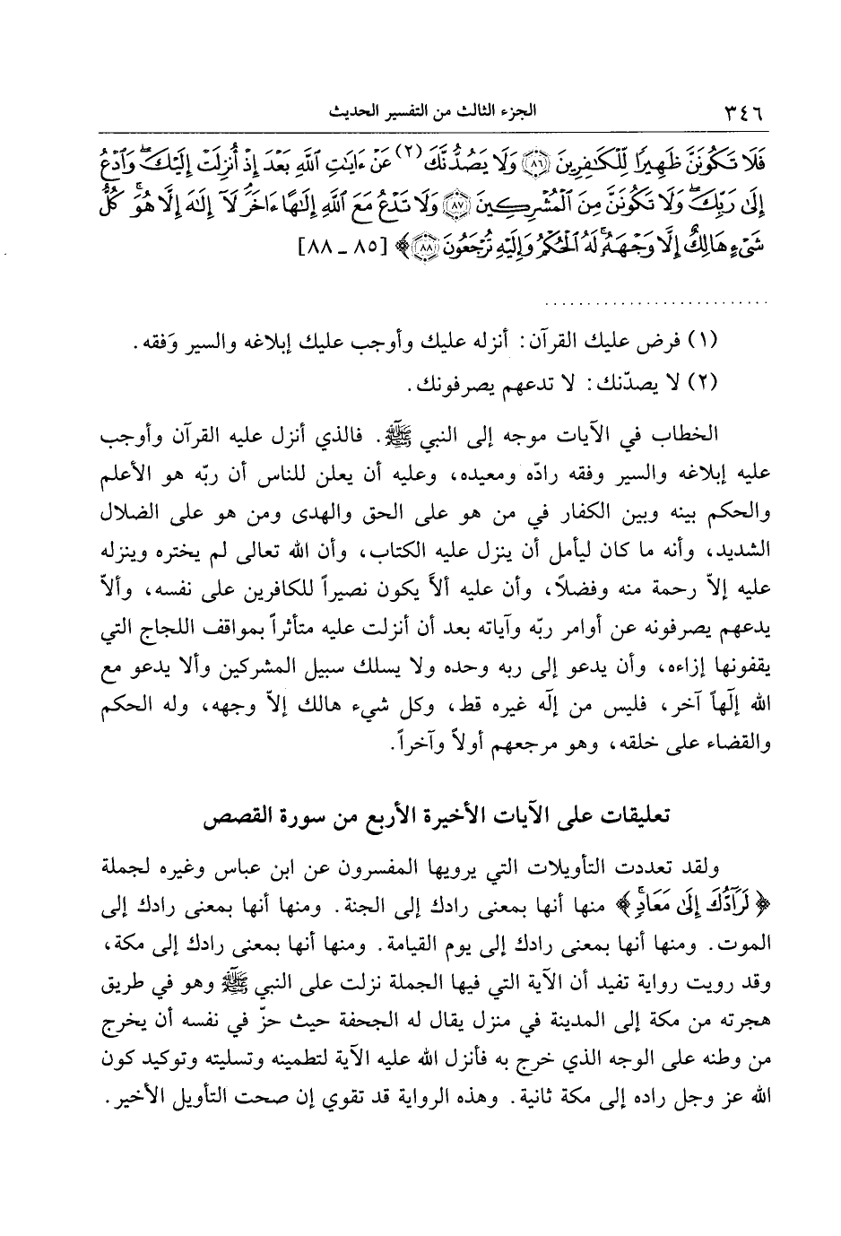 الخطاب في الآيات موجه إلى النبي صلى الله عليه وسلم. فالذي أنزل عليه القرآن وأوجب عليه إبلاغه والسير وفقه رادّه ومعيده، وعليه أن يعلن للناس أن ربّه هو الأعلم والحكم بينه وبين الكفار في من هو على الحق والهدى ومن هو على الضلال الشديد، وأنه ما كان ليأمل أن ينزل عليه الكتاب، وأن الله تعالى لم يختره وينزله عليه إلّا رحمة منه وفضلا، وأن عليه ألّا يكون نصيرا للكافرين على نفسه، وألّا يدعهم يصرفونه عن أوامر ربّه وآياته بعد أن أنزلت عليه متأثرا بمواقف اللجاج التي يقفونها إزاءه، وأن يدعو إلى ربه وحده ولا يسلك سبيل المشركين وألا يدعو مع الله إلها آخر، فليس من إله غيره قط، وكل شيء هالك إلّا وجهه، وله الحكم والقضاء على خلقه، وهو مرجعهم أولا وآخرا.